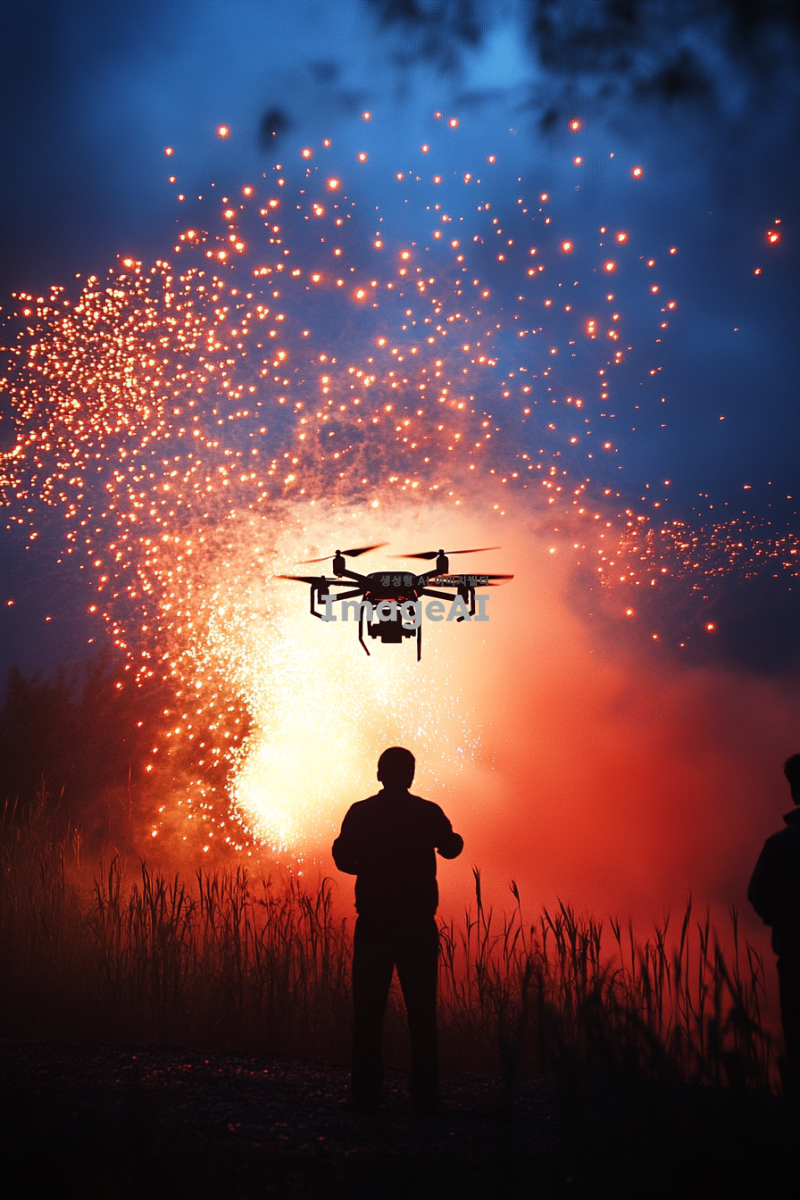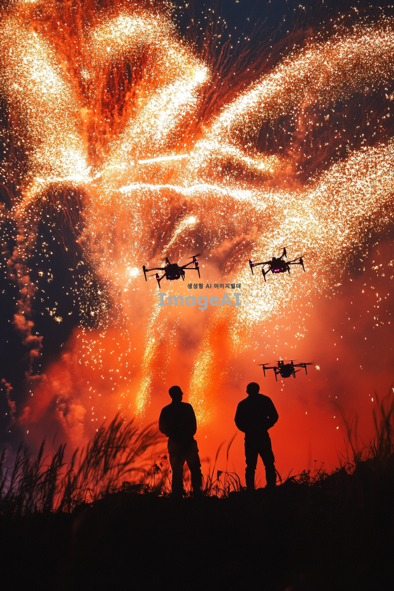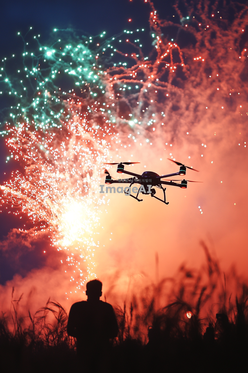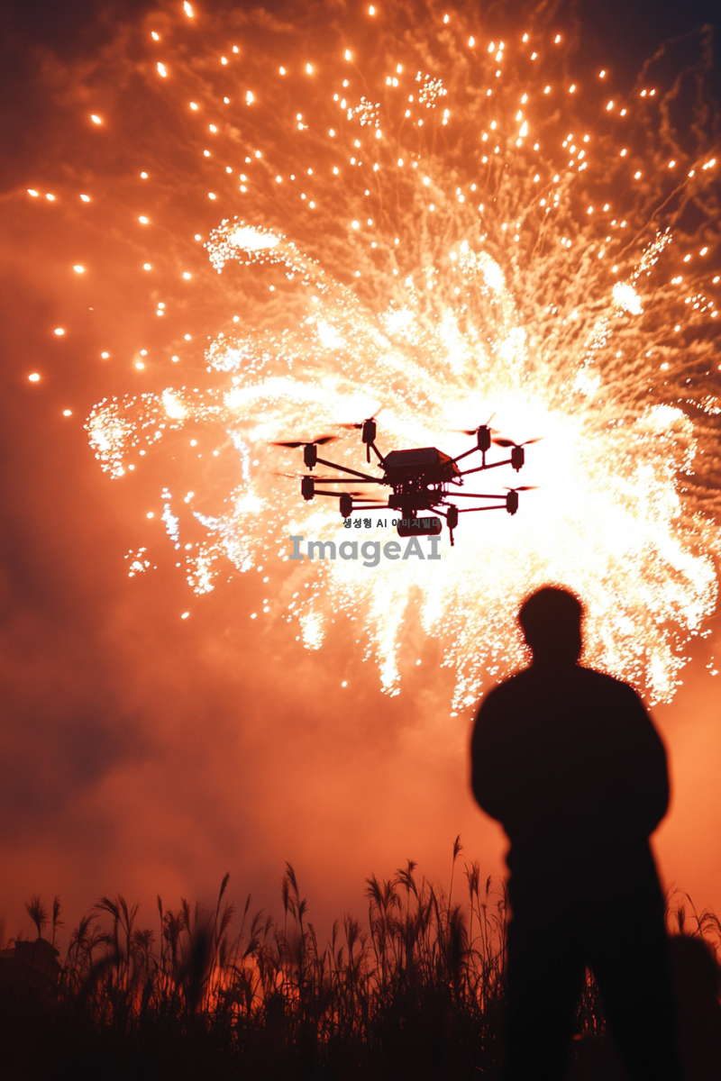 현대적인 드론쇼가 펼쳐지는 제주도 축제, 드론들이 하늘을 수놓으며 화려한 불꽃을 만들어내고 있는 모습, 현대적인 요소로 가득한 축제 분위기, 사람들은 보이지 않지만 뒷모습의 그림자들이 드론쇼를 감상하고 있는 듯한 느낌을 주는 장면. 밤하늘의 감성적인 분위기를 강조, 불과 빛, 밤이지만 밝고 화려한 느낌, 축제 포스터 느낌