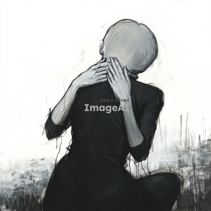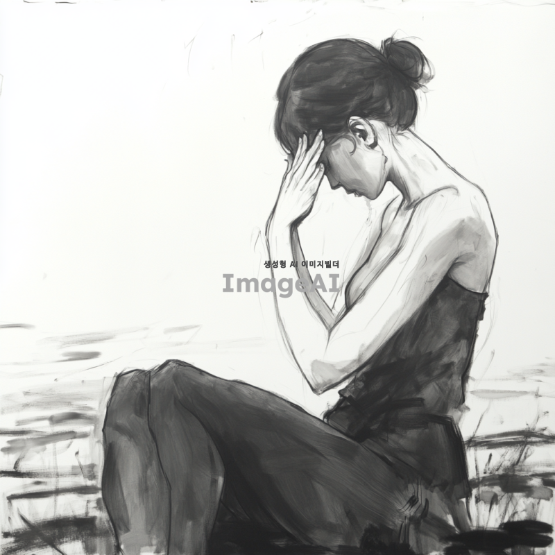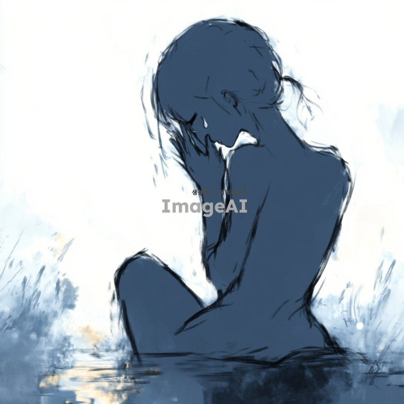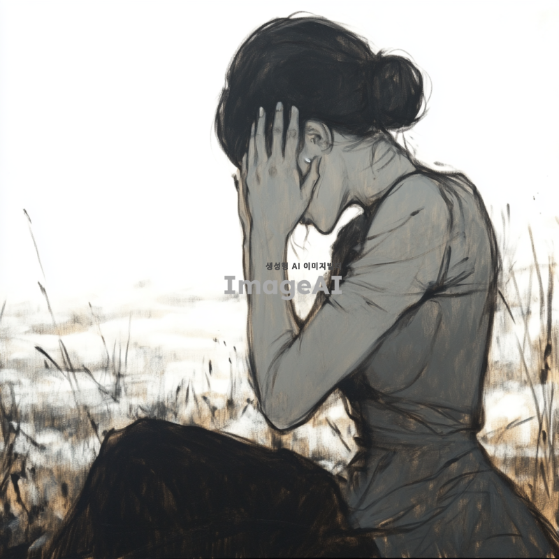 부상을 입어 무릎에 눕힌 채 위의 사람의 눈물을 닦아주는 사람의 인체를 그려주세요. 그녀는고통스러운 표정을 짓고 있으며, 주변은 흐릿하게 처리되어 집중할 수 있도록 합니다. 배경은 저녘의 풍경으로 설정하여 감정적인 분위기를 강조합니다.