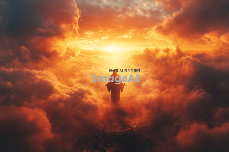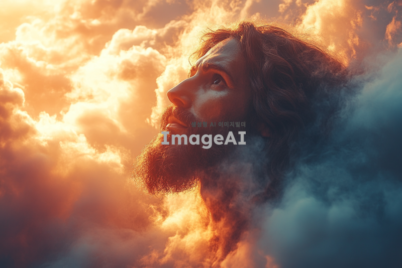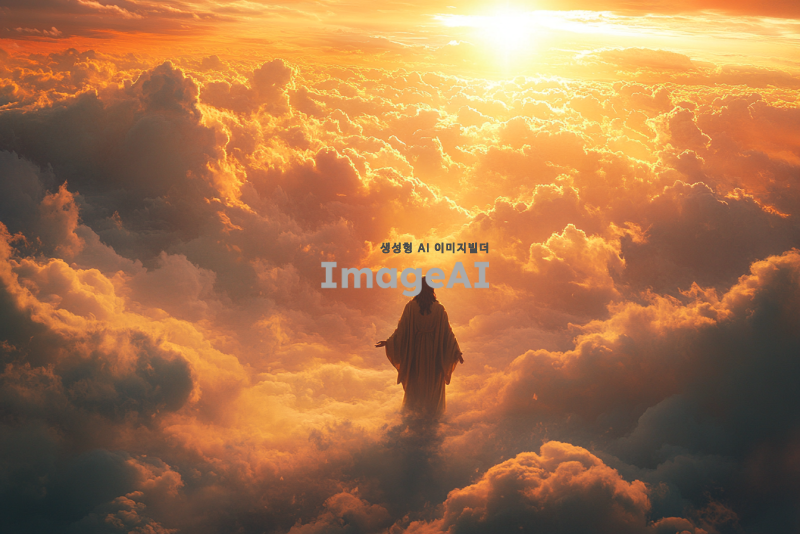 예수님이 구름 속에서 인자한 팔을 벌리고 멀리서 서 있는 모습, 부드러운 빛이 그를 감싸고 있으며, 평화로운 분위기가 느껴지는 배경, 구름은 부드럽고 흰색으로, 하늘은 따뜻한 아름다운 일몰 풍경, 예수님은 멀리 서있다