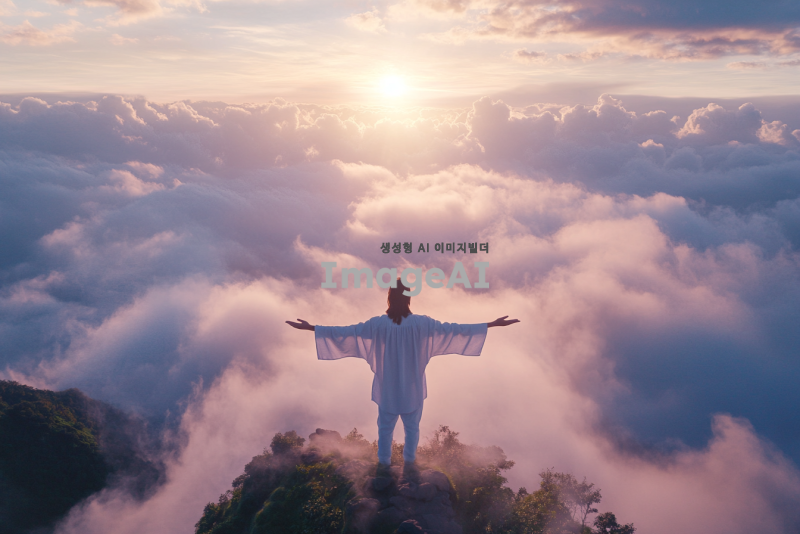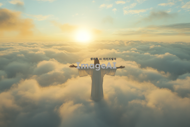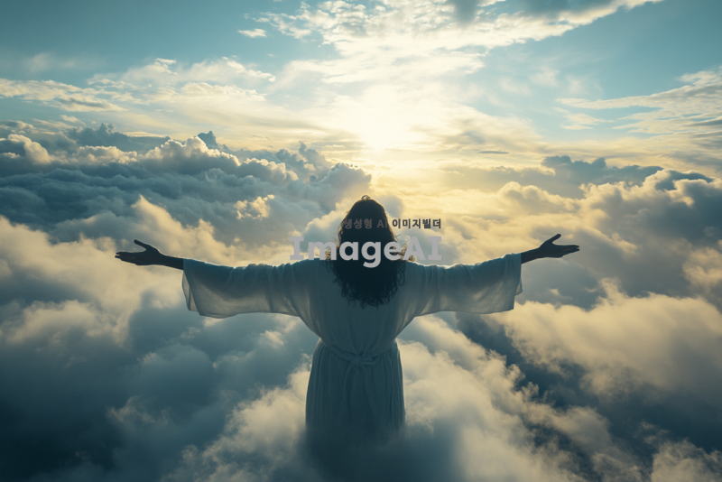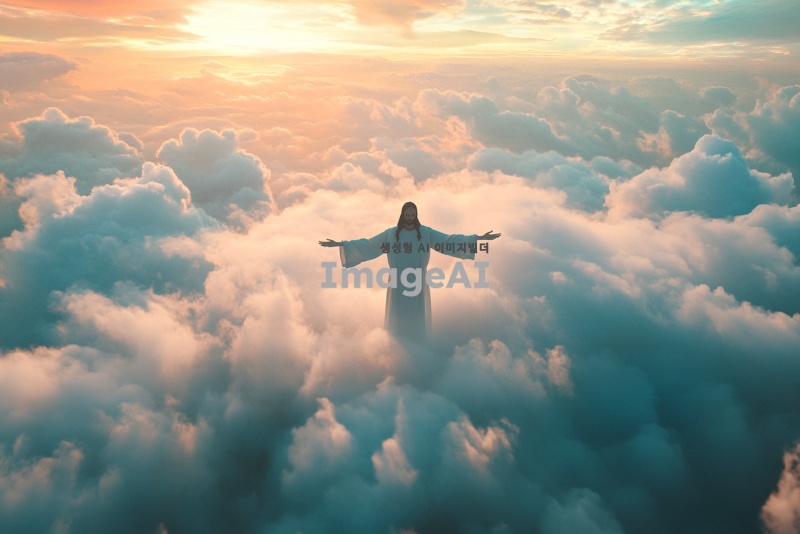 예수님이 구름 속에서 인자한 팔을 벌리고 멀리서 서 있는 모습, 부드러운 빛이 구름을 비추고, 평화로운 분위기, 신성한 느낌이 드는 풍경, 한국적인 요소가 가미된 배경, 하늘과 구름의 아름다움이 강조된 장면.