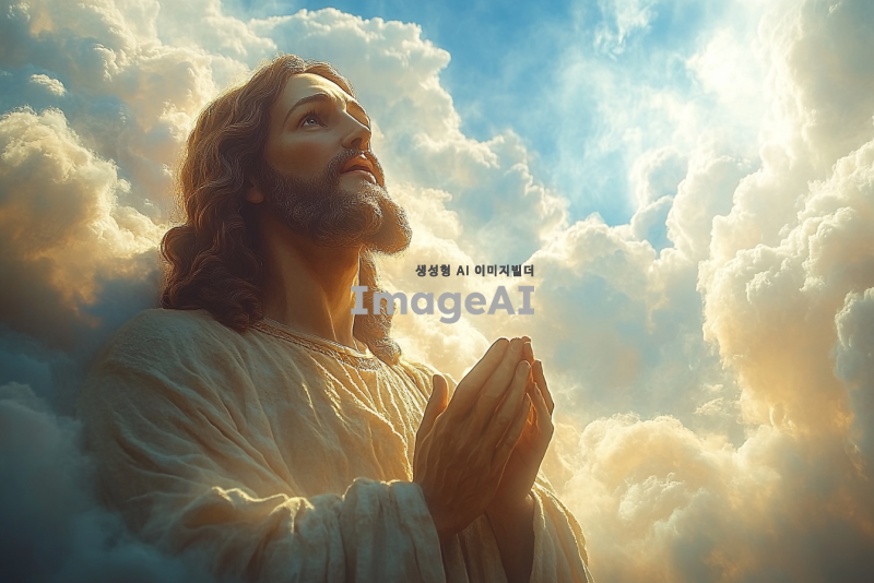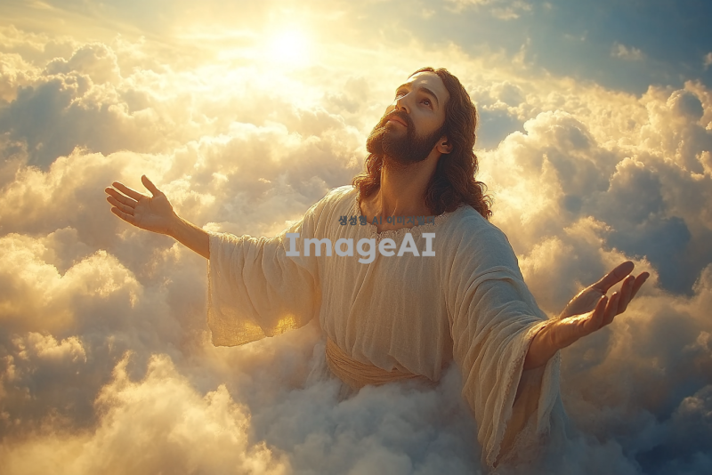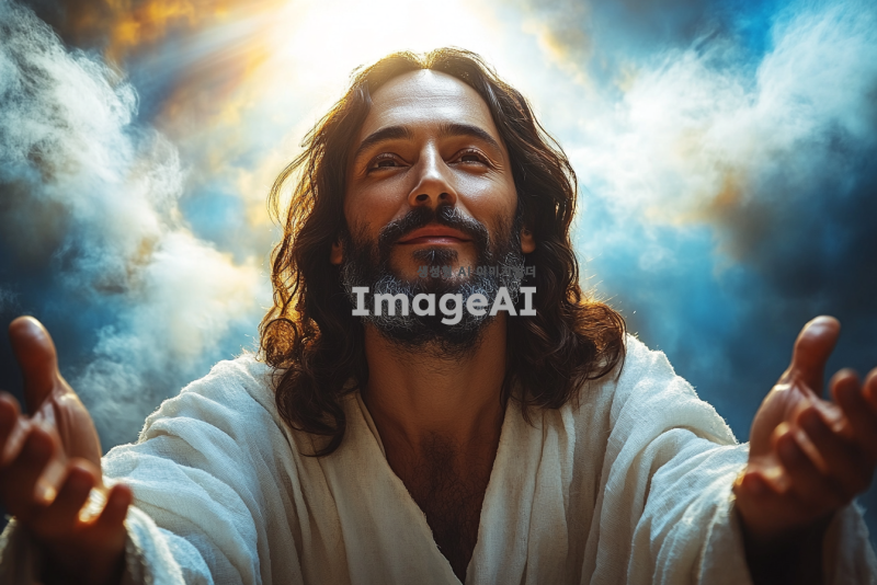 예수님이 구름 속에서 인자한 표정으로 팔을 벌리고 서 있는 모습, 하늘은 푸르고 구름이 부드럽게 흘러가며 빛이 환하게 비추고 있는 장면, 신성한 분위기와 평화로운 느낌을 강조하여 표현.