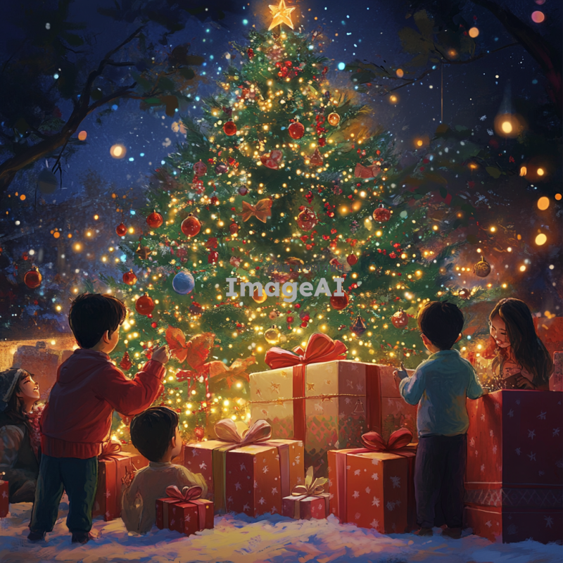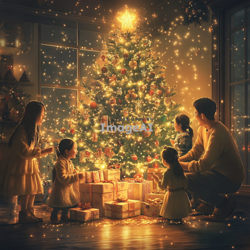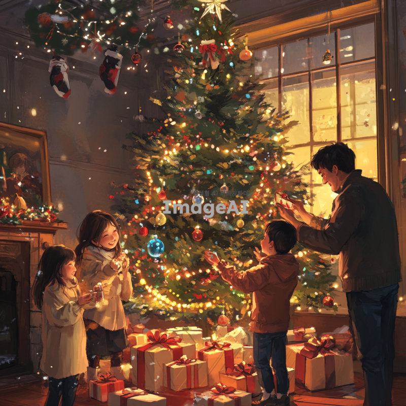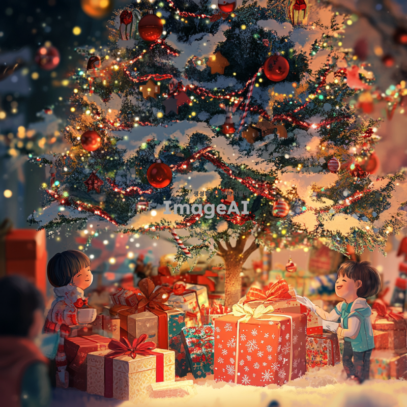 아름다운 크리스마스 트리 아래에 놓인 다양한 선물들이 화려하게 포장되어 있는 장면, 트리의 반짝이는 조명과 다채로운 장식들, 따뜻한 분위기의 크리스마스 배경, 한국의 전통적인 요소가 가미된 선물 포장, 행복한 가족이 함께 모여 선물을 바라보며 웃고 있는 모습.