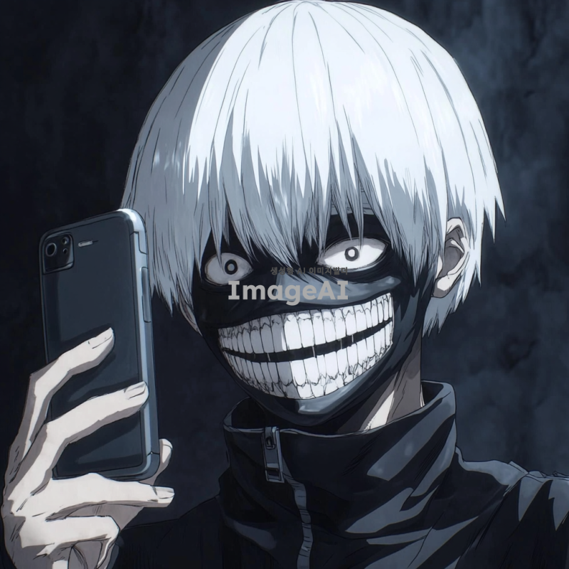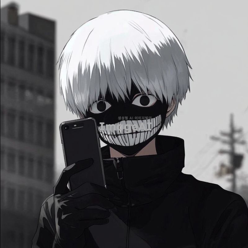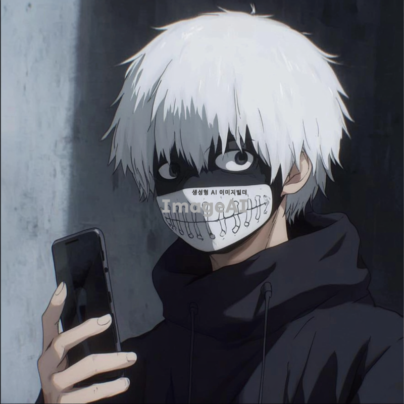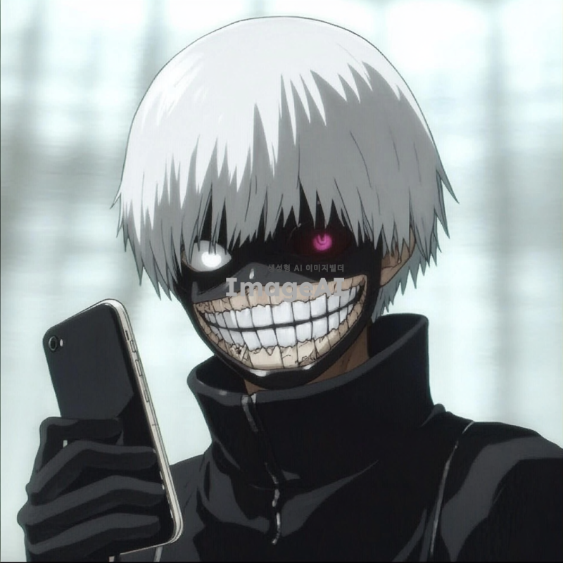 토쿄 구울 스타일의 흰머리 마스크를 쓴 애니메이션 캐릭터가 전화기를 들고 예측할 수 없는 미소를 짓고 있는 모습, 단색 배경에.