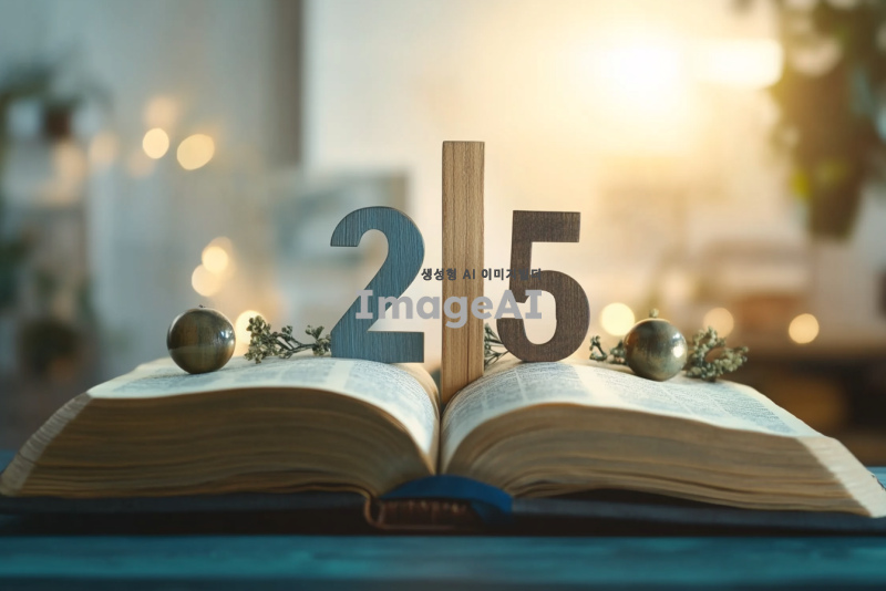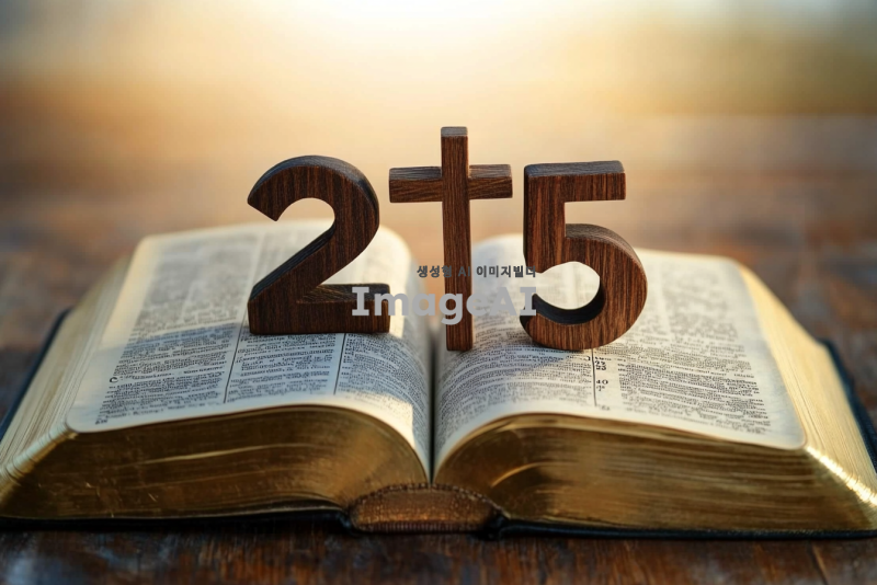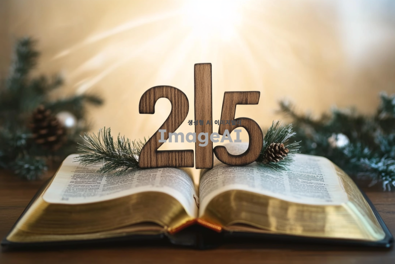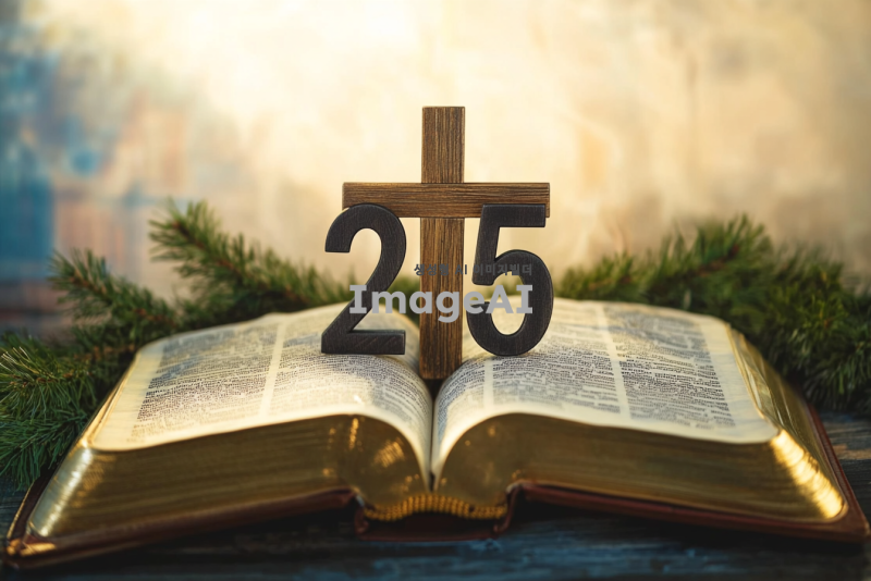 반쯤 펼처진 성경책 위에 나무로 만들어진 2025 장식품이 올라가있으면 좋겠어. 20과 25 사이엔 나무로 된 십자가 장식품이 올라가있으면 좋겠어. 평화로운 분위기를 강조.