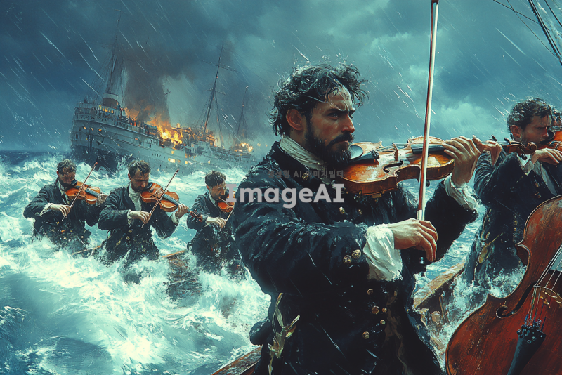 침몰하는 타이타닉호에서 구명정에 타는 사람들을 뒤로하고 열심히 연주하고 있는 4명의 오케스트라 단원들과 1명의 지휘자를 실제 사진처럼 그려줘.