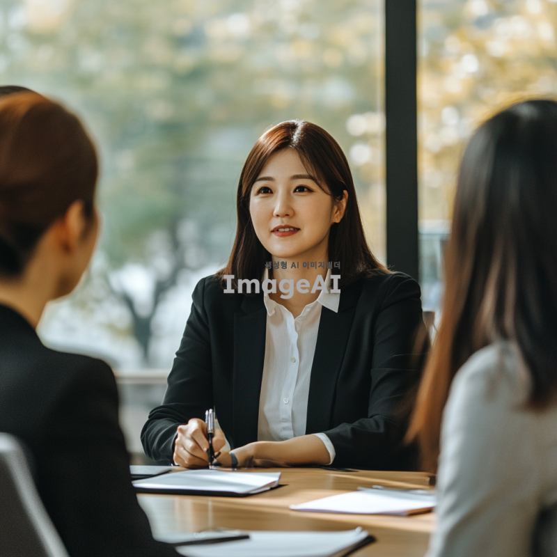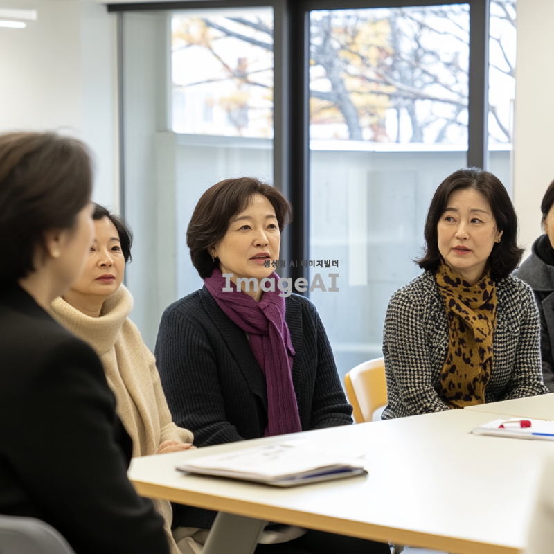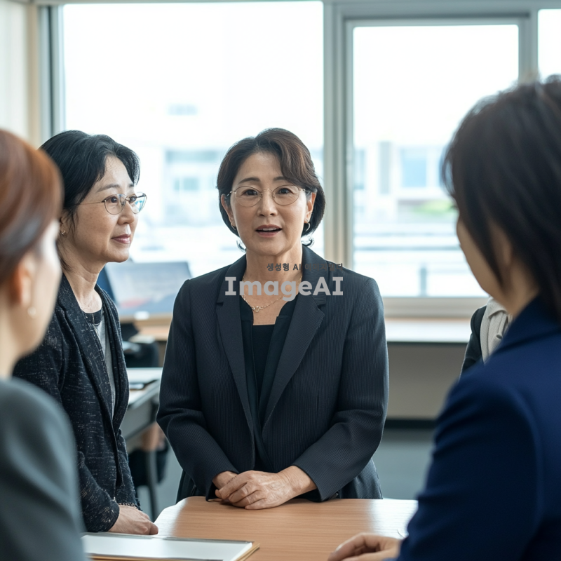 50대 한국인 여성 면접관 5명이 지원자를 보고있는 것. 배경에는 고등학교로 자연광이 들어오는 창문이 있는 공간, 전문적이고 진지한 분위기.