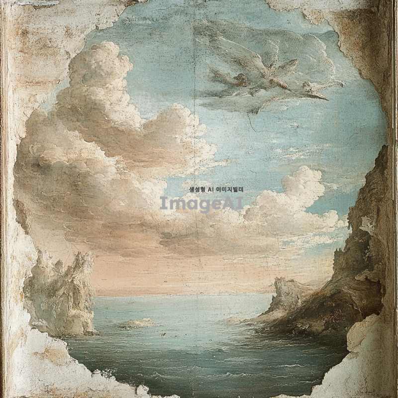 A picture of the creation of the sky. The scene shows the separation of waters, with a clear sky forming above and the seas remaining below, representing the expanse of heaven and earth