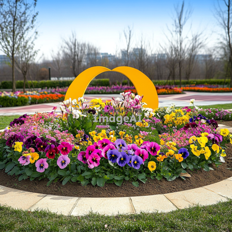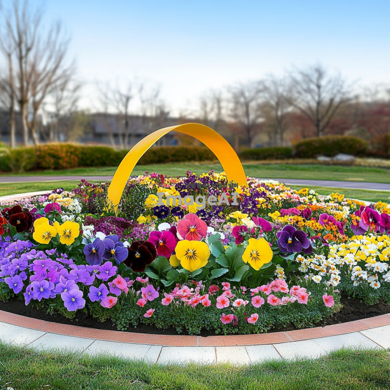 봄꽃 팬지와 비올라로 가득 찬 원형 패턴화단의 아름다운 풍경, 화사한 색감과 다양한 꽃들이 조화롭게 어우러진 모습, 햇살 아래 반짝이는 꽃잎, 자연의 아름다움을 강조한 따뜻한 분위기, 생동감 넘치는 봄의 정취가 느껴지는 장면