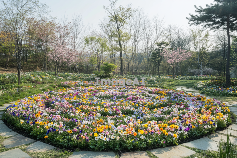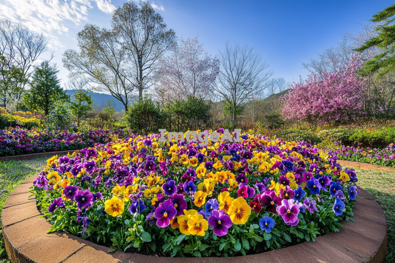 봄꽃 팬지와 비올라로 가득 찬 지름 10m 정도의 원형 화단의 모습. 화사한 색상의 팬지와 비올라가 조화롭게 어우러져 있는 풍경, 햇살이 비치는 따뜻한 봄날의 분위기. 화단 주변에는 푸른 잔디와 작은 돌길이 둘러싸여 있으며, 배경에는 흐드러진 벚꽃나무가 보인다. 전체적으로 생동감 넘치고 화려한 봄의 정취가 느껴지는 장면.