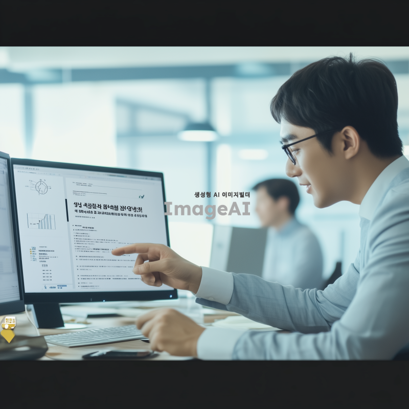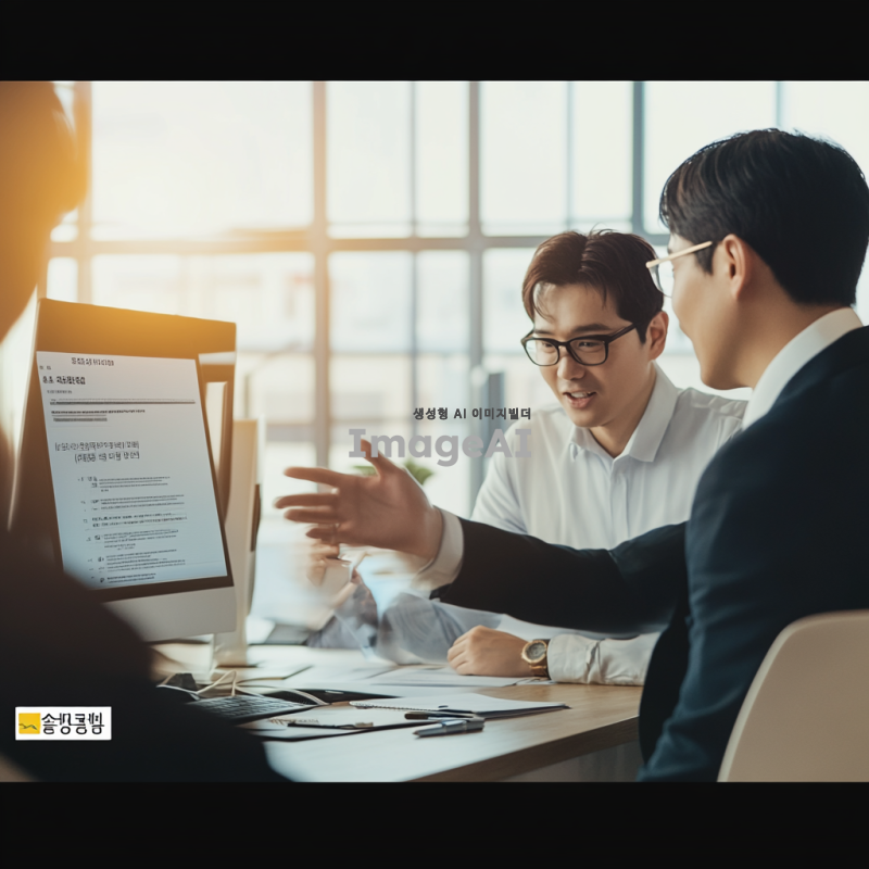 밝은 배경에서 비즈니스맨들이 서로의 PC 화면을 보며 활발하게 대화하는 모습. 각 비즈니스맨은 한국인으로, 다양한 표정과 제스처를 통해 소통하는 모습이 강조됨. 주변에는 사무실 환경이 드러나고, 자연광이 들어오는 창문이 보인다.