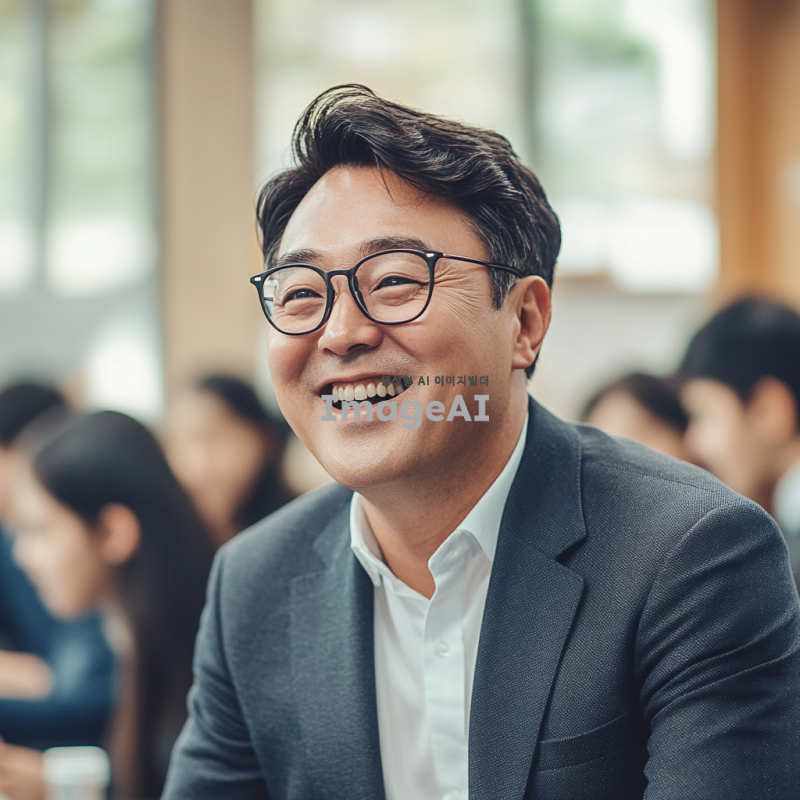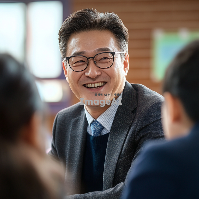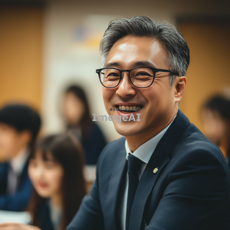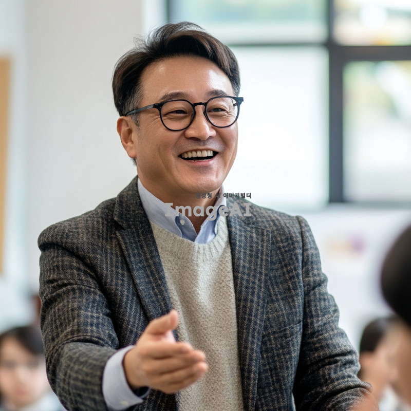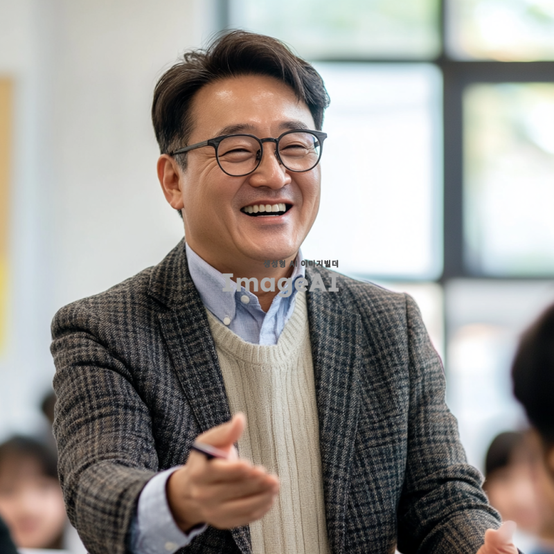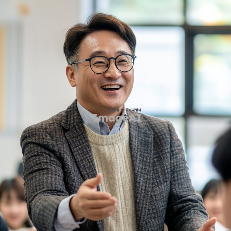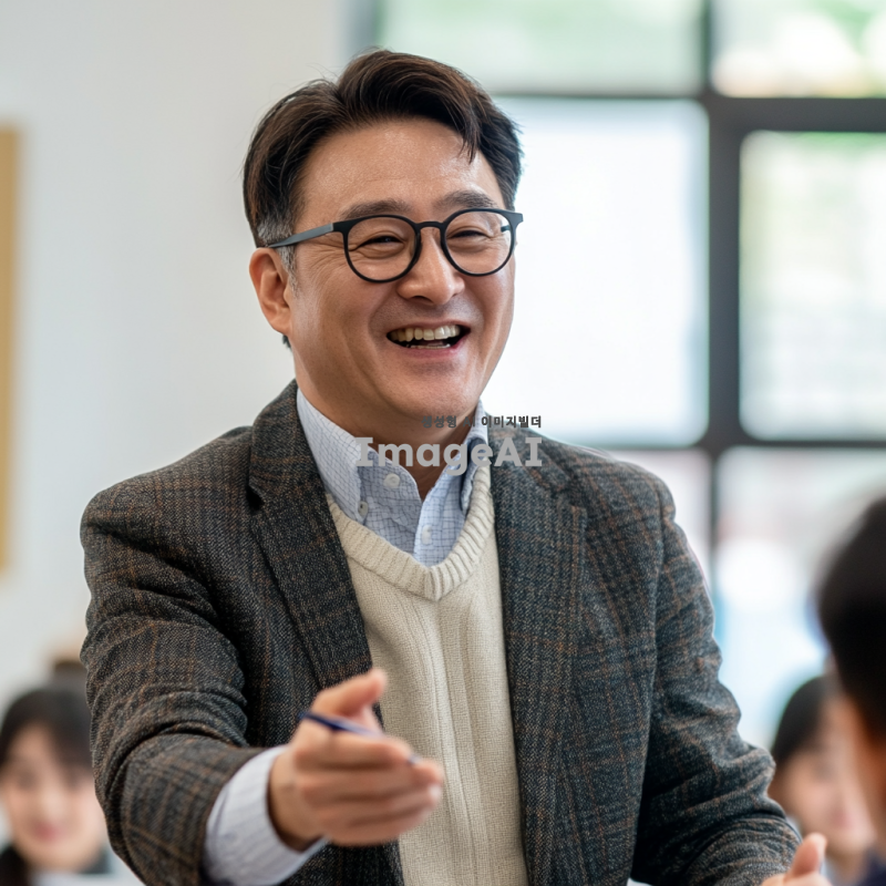 50대의 멋진 한국 남자 선생님이 안경을 쓰고 정장을 입고, 즐겁게 수업하는 모습을 담은 이미지. 교실 배경에서 학생들과 소통하며 활짝 웃고 있는 모습, 따뜻한 분위기와 지적인 인상 강조.