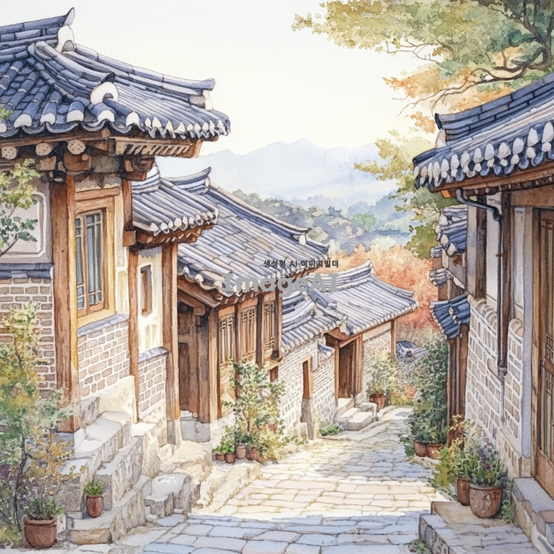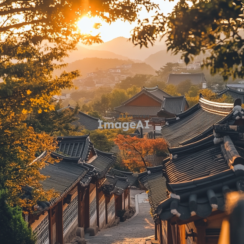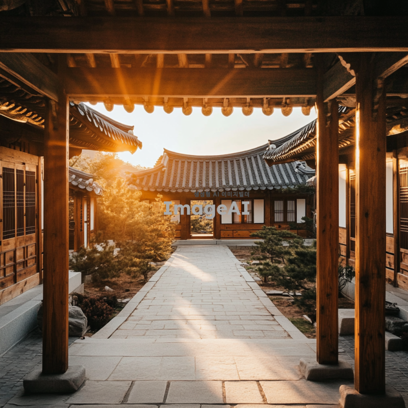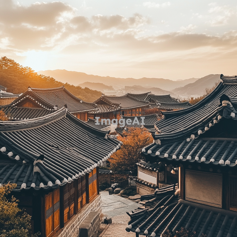 한국의 전통 한옥 마을, 고즈넉한 분위기 속에 펼쳐진 아름다운 한옥들, 고요한 골목길, 전통 기와지붕과 나무 기둥, 따스한 햇살이 비치는 풍경, 한국의 전통 문화와 역사적인 느낌이 물씬 풍기는 장면.