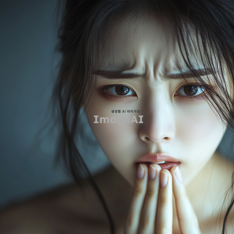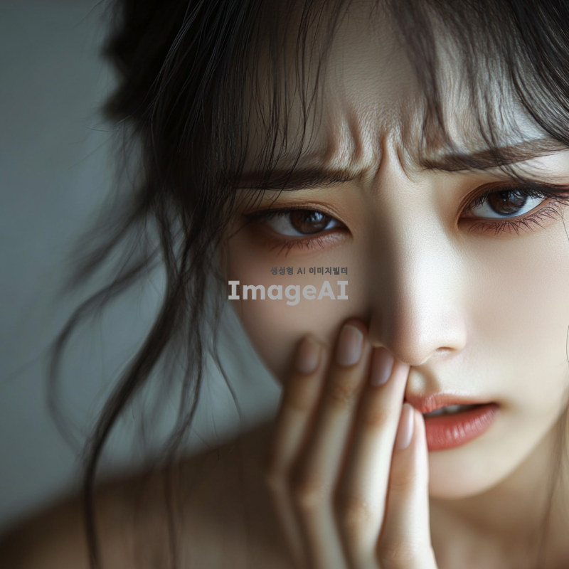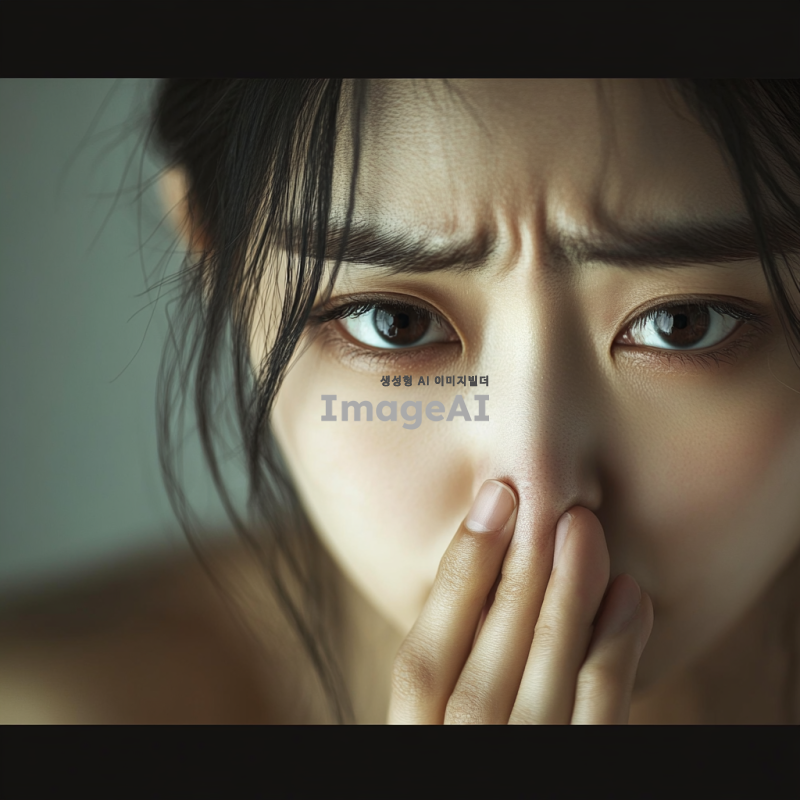 아름다운 한국 여성, 코뼈가 부러져서 고통스러워하는 표정을 짓고 있는 모습. 그녀의 눈에서는 고통이 느껴지며, 주변은 어두운 조명으로 분위기를 강조하고 있다. 그녀의 얼굴은 섬세한 특징을 가지고 있으며, 머리는 자연스럽게 흐트러져 있다. 배경은 흐릿하게 처리되어 그녀의 감정에 집중할 수 있도록 하고 있다.
