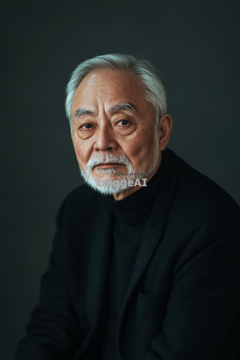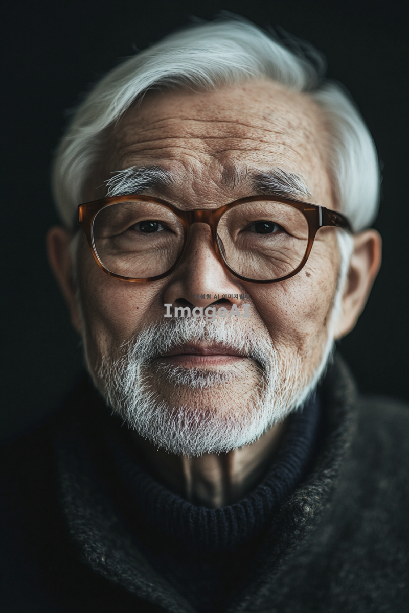 스튜디오에서 촬영한 노인의 독사진. 은은한 조명아래서 찍힌사진. 한국적인 사진.