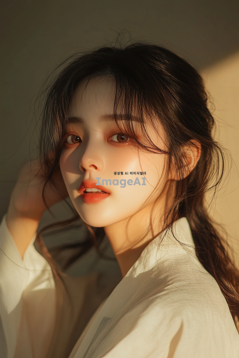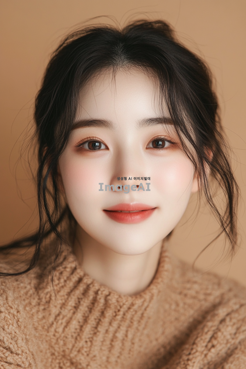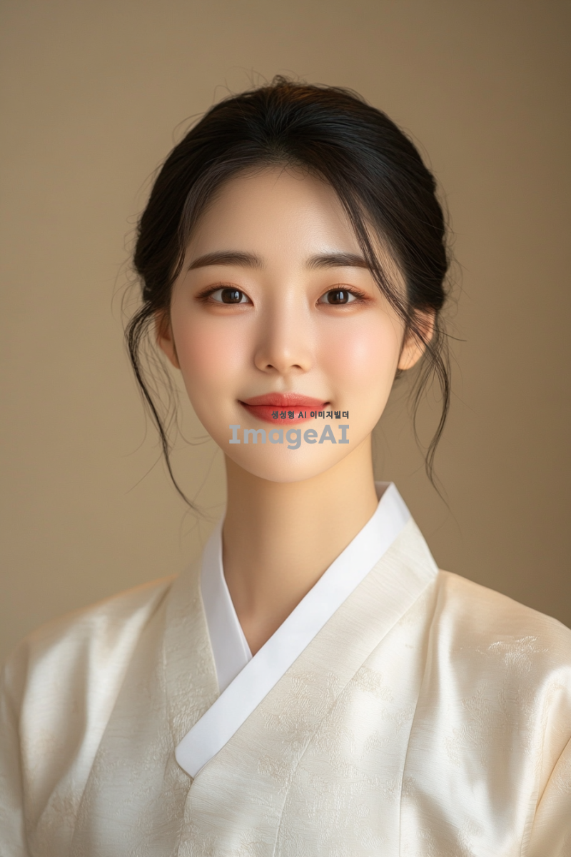 스튜디오에서 촬영한 독사진, 은은한 조명 아래에서 한국적인 분위기를 강조한 이미지, 온화한 미소를 짓고 있는 한국인 모델, 부드러운 피부톤과 자연스러운 헤어스타일, 전통적인 한국 의상이나 현대적인 스타일의 조화, 배경은 심플하고 따뜻한 색감으로 설정.