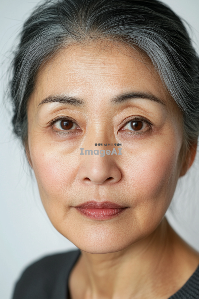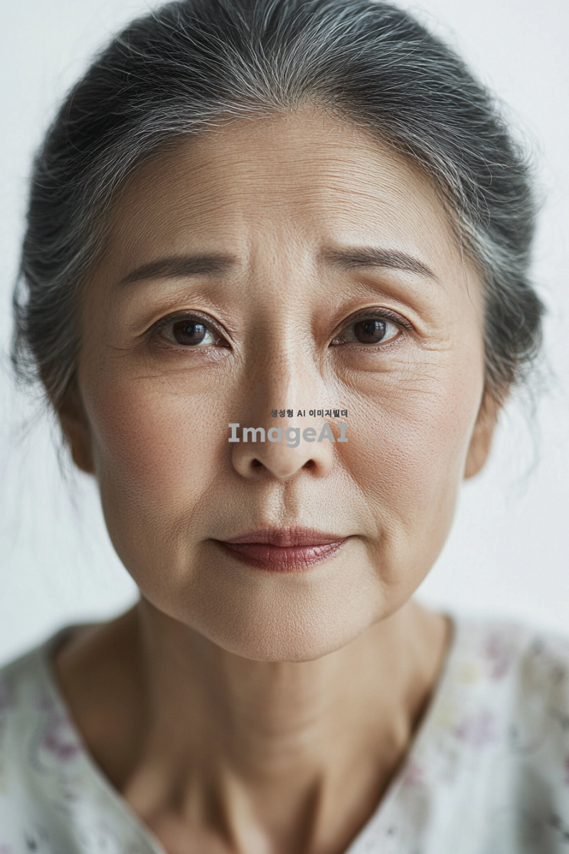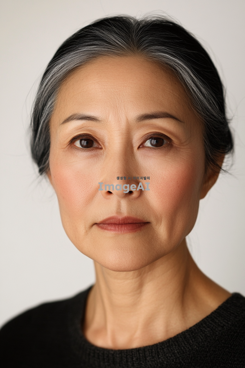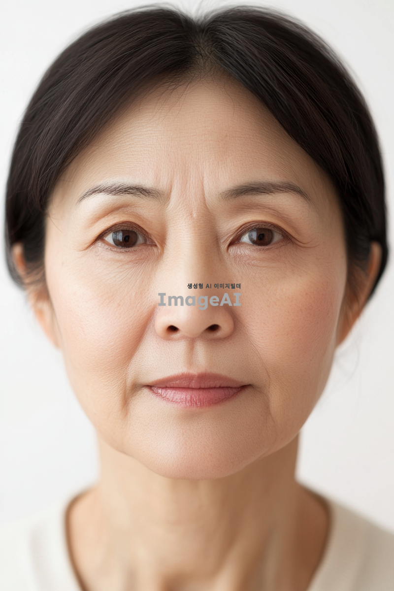 - 오십 대의 아시아 여성의 포토리얼리스틱 스튜디오 초상화. 그녀 얼굴에는 부드러운 특징이 드러난다. 배경은 단순한 흰색으로, 그녀에게만 집중하게 한다. 카메라를 직접 바라보며 부드럽거나 사색적인 표정을 짓고 있다. 사진에는 텍스트나 그래픽이 없다.