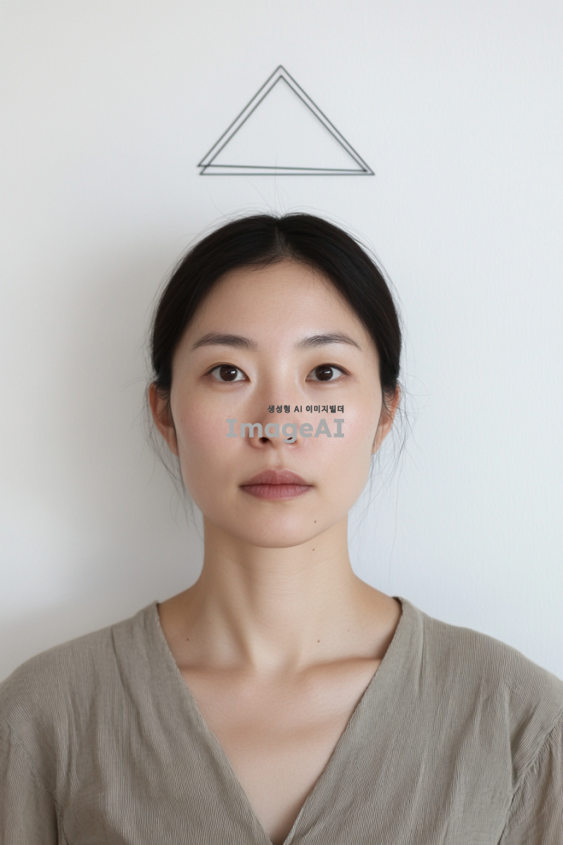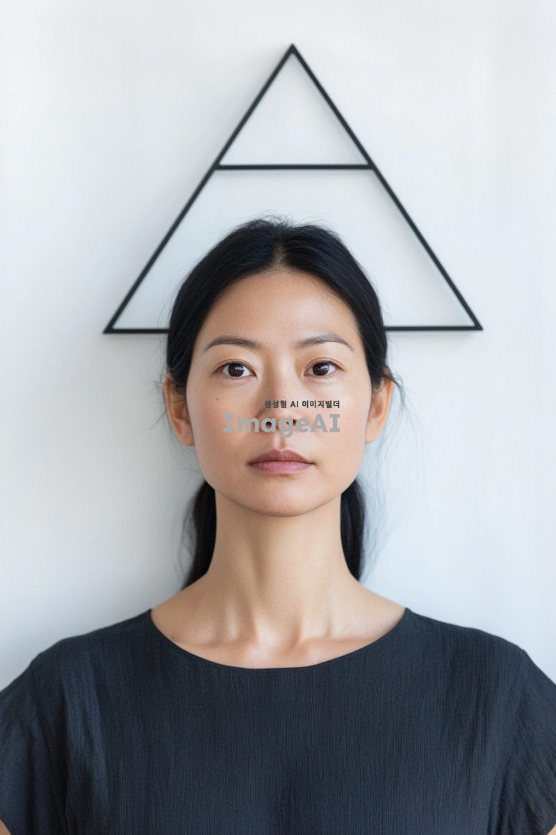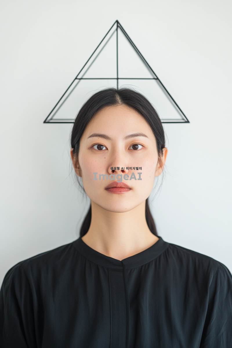 A photo of an Asian woman in her late thirtie. She has black hair tied back to her shoulders. The background is a plain white. Her face looks straight ahead, with no shadows on it. In front of her stands a simple geometric figure of one triangle above another, with the two triangles standing opposite each other.