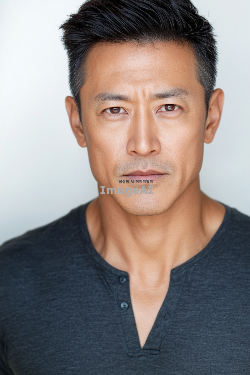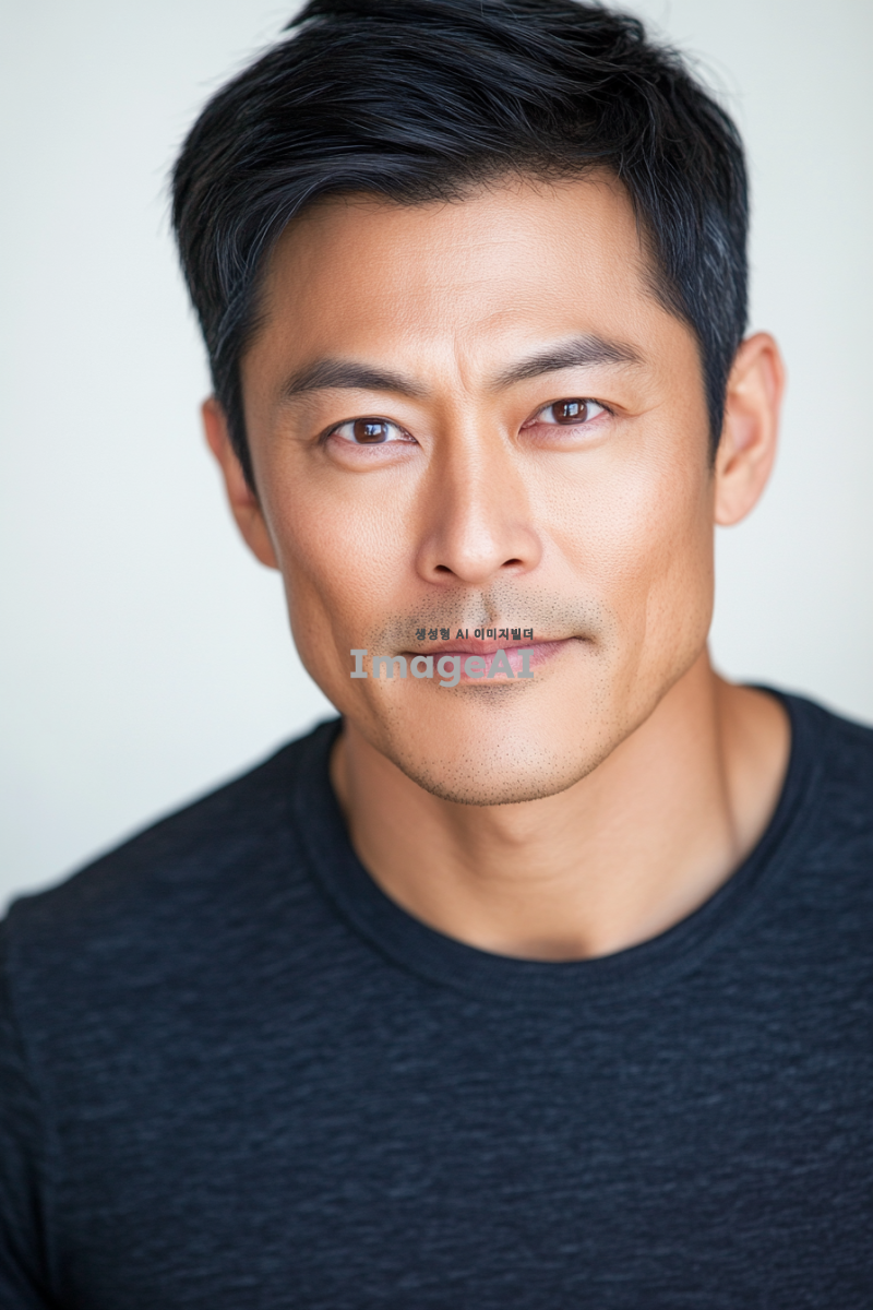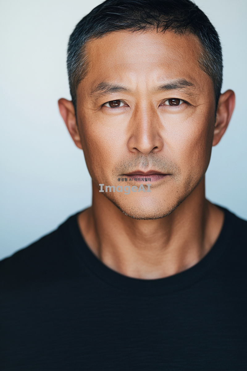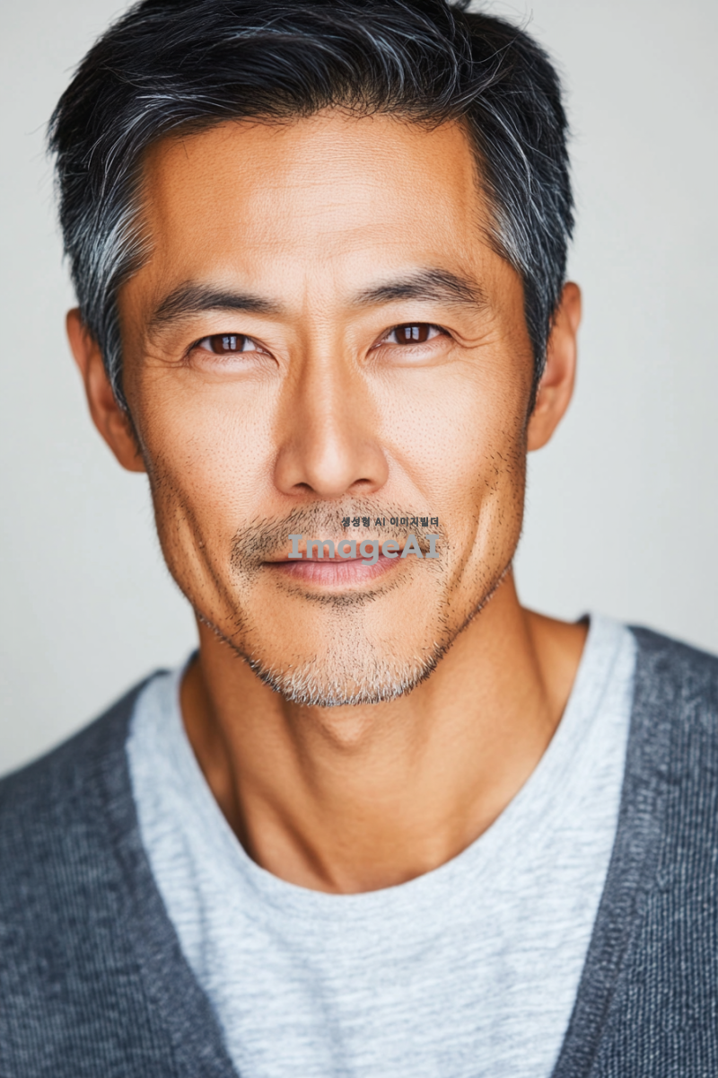 아시아계 남성이 50대에 편안한 차림으로 짧은 머리를 가진 사진. 배경은 흰색이다. 이 이미지는 스튜디오에서 부드러운 조명으로 촬영된 헤드샷으로, 얼굴에 그림자가 없고 카메라가 그를 직접 바라보고 있다. 이미지는 피부 질감과 모공을 고해상도로 포착하고 있다.