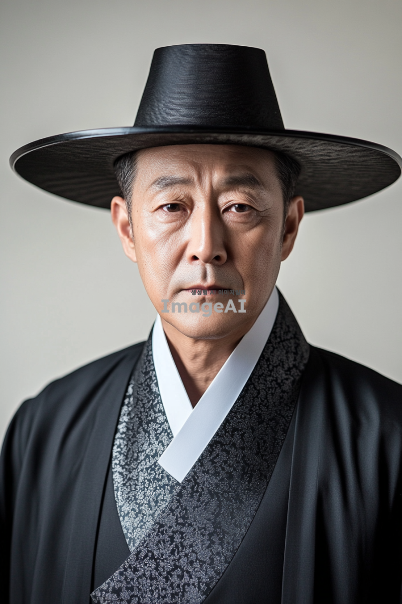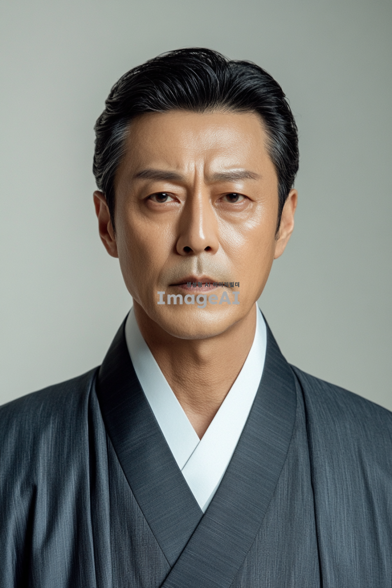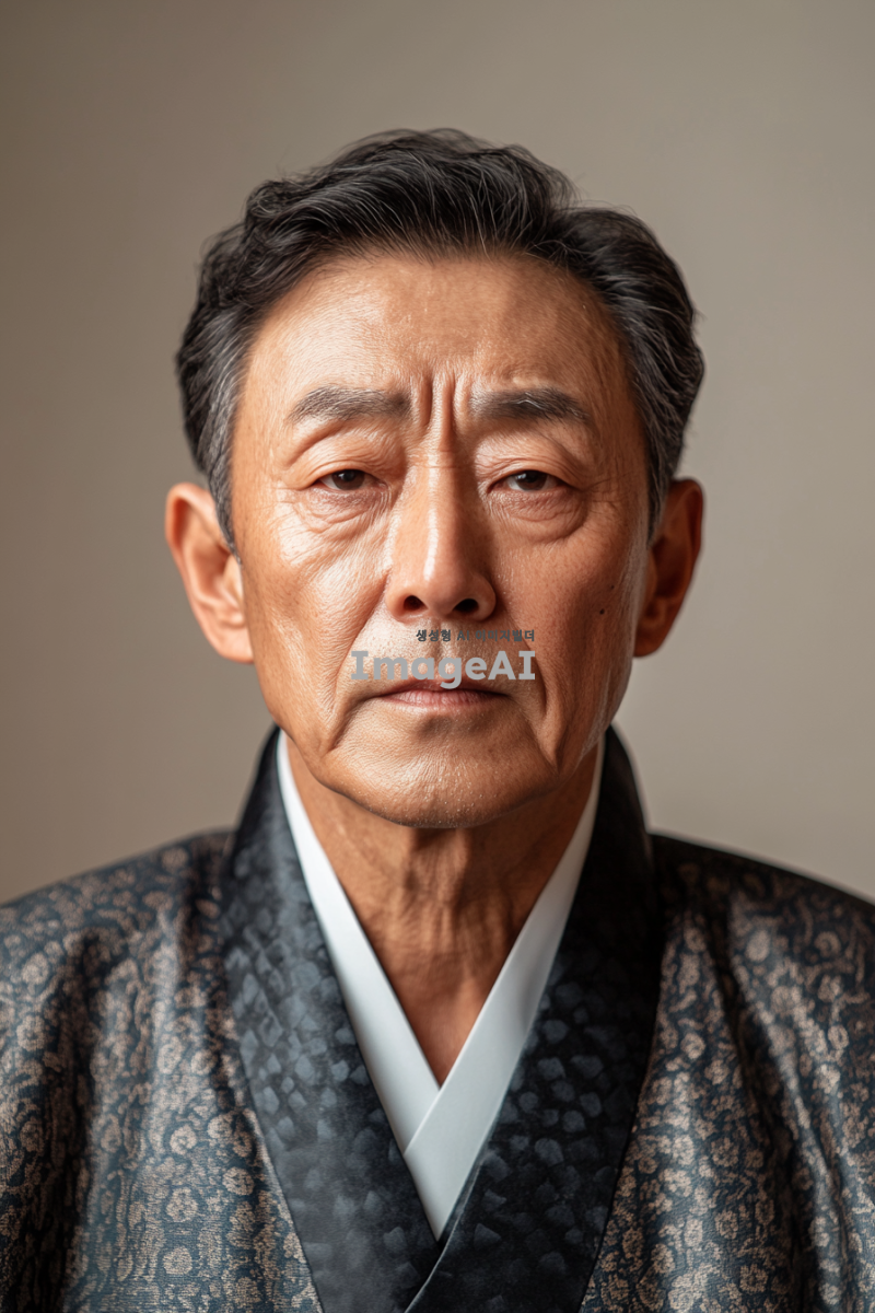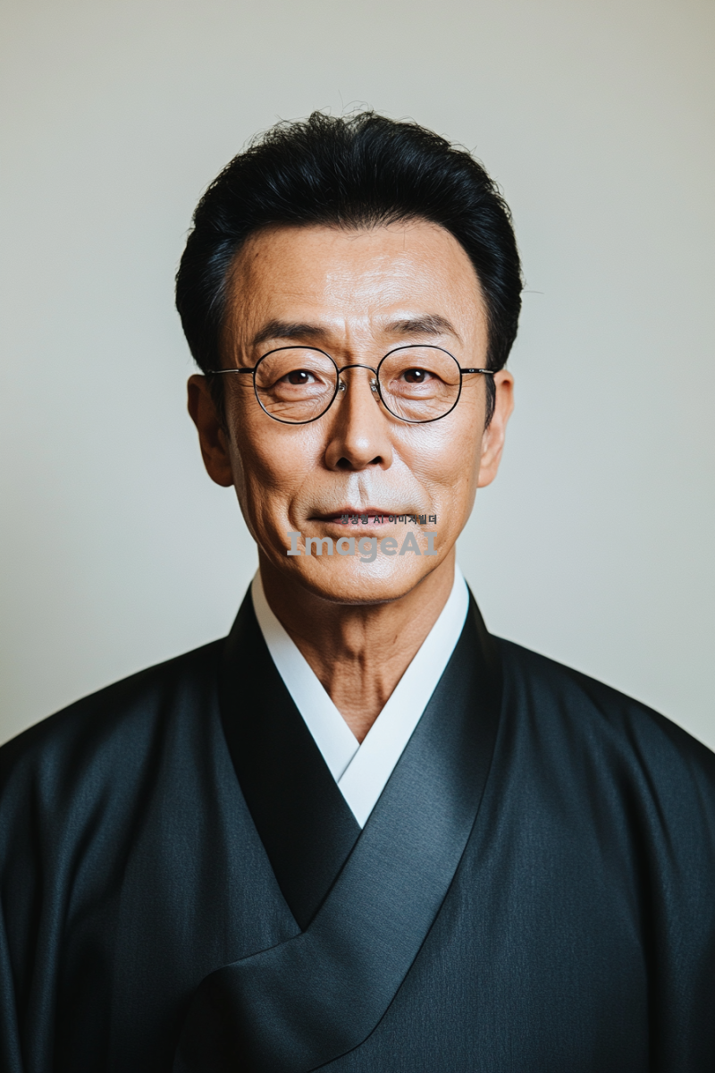 한국의 전통적인 스튜디오에서 촬영된 영정사진, 정면을 바라보며 차분하고 dignified한 표정을 짓고 있는 한국인 남성, 중년의 모습, 단정한 차림, 배경은 화이트 톤, 조명은 자연스럽고 부드럽게 얼굴을 비추는 느낌, 고급스러운 분위기, 감정이 담긴 눈빛, 클래식한 스타일의 포즈.