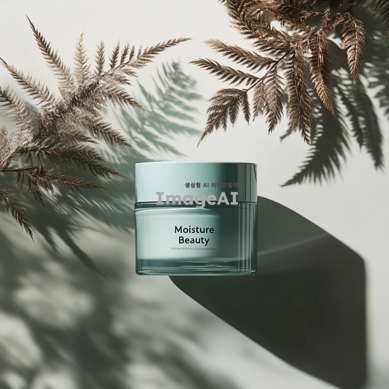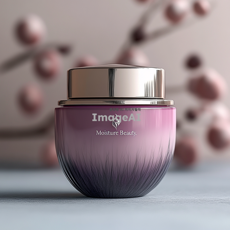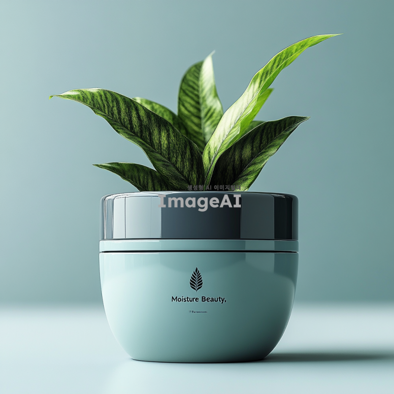 화장품 용기에 "수분미인"이라는 로고가 디자인된 모습, 세련되고 현대적인 느낌의 패키지, 부드러운 곡선과 자연을 연상시키는 색상 조합, 고급스러운 텍스처와 함께 로고가 돋보이도록 배치된 이미지, 배경은 깨끗하고 심플한 느낌으로, 수분과 자연의 이미지를 강조한 요소들 추가.