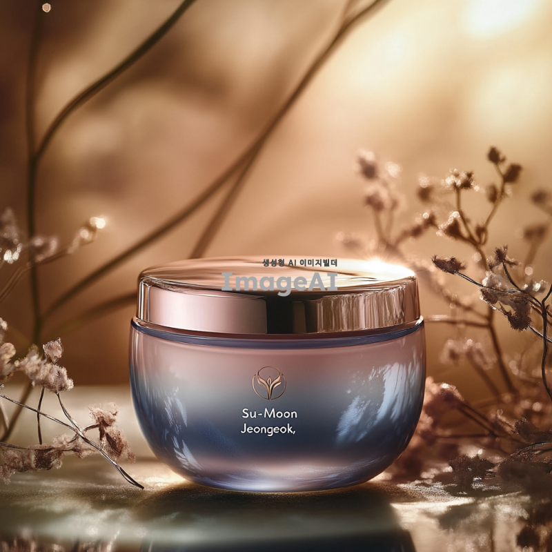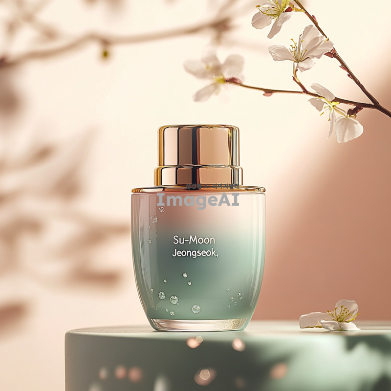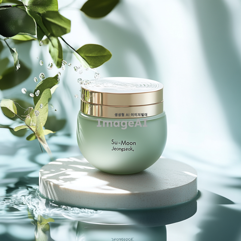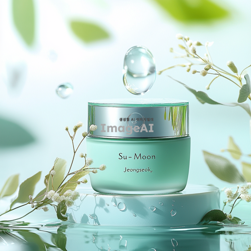 수분정석이라는 로고가 들어간 세련되고 현대적인 디자인의 화장품 용기, 부드러운 곡선이 강조된 형태, 고급스러운 느낌의 유리 소재, 파스텔 톤의 색상 조합, 자연을 연상시키는 배경, 청량한 느낌의 물방울과 식물 요소가 어우러진 풍경, 따뜻한 햇살이 비치는 느낌, 전체적으로 신선하고 편안한 분위기.