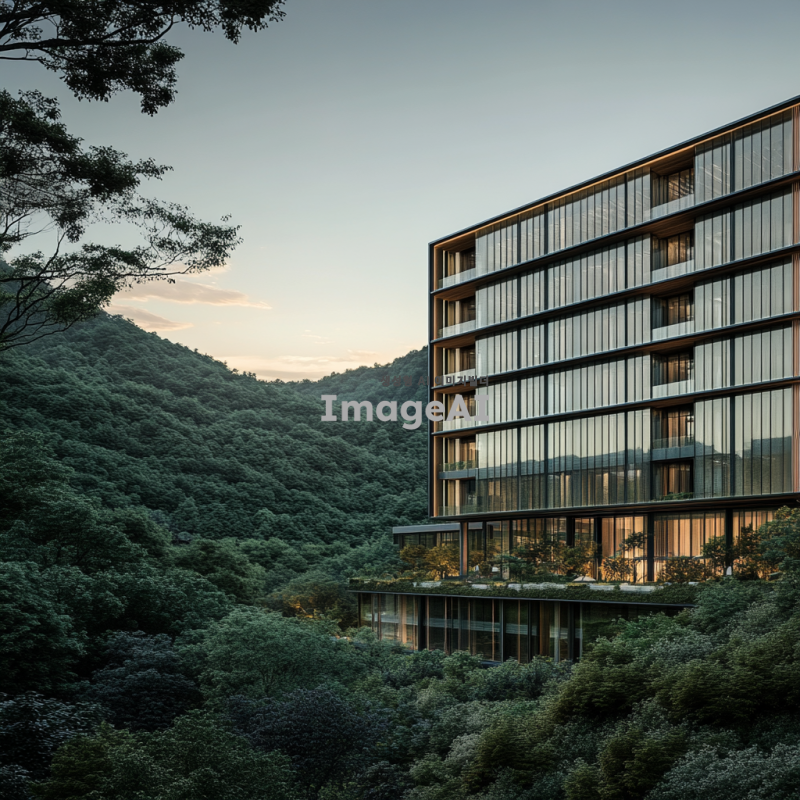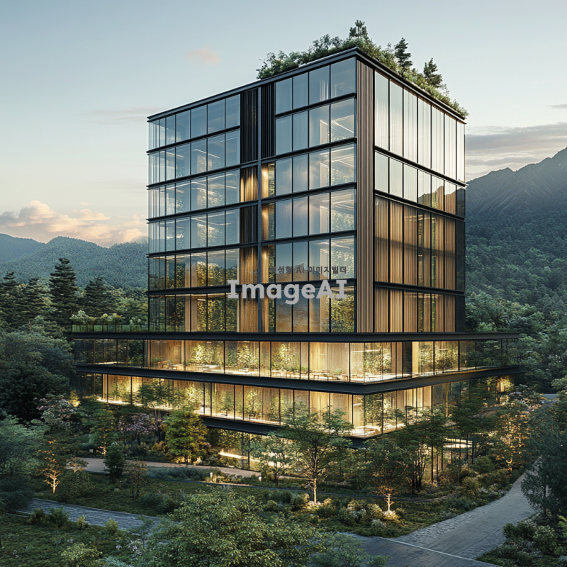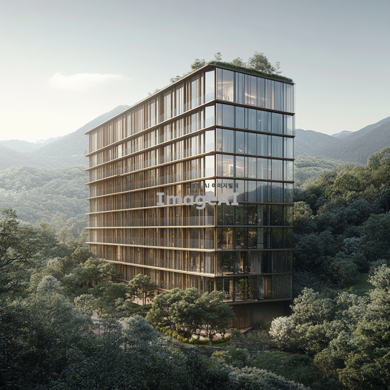 산 속에 위치한 10층 건물, 자연과 조화를 이루는 현대적인 디자인, 주변의 푸른 나무들과 맑은 하늘, 건물의 유리창에서 반사되는 산의 경치, 따뜻한 햇살이 비치는 풍경, 평화롭고 고요한 분위기.