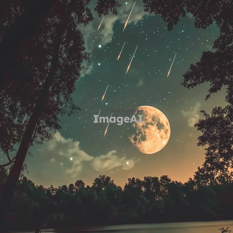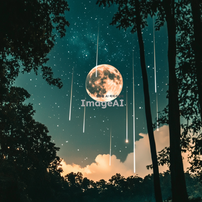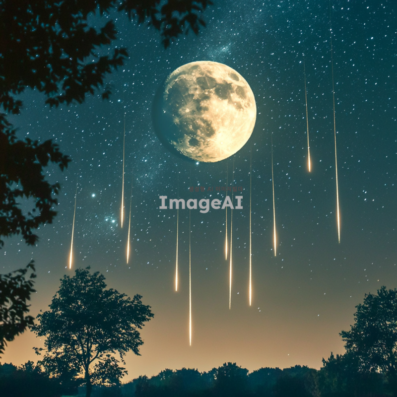 어두운 밤하늘에 빛나는 커다란 달이 떠 있고, 그 주변으로 여러 개의 유성이 떨어지는 장면. 유성이 하늘을 가로지르며 반짝이고, 달빛이 주변을 은은하게 비추는 모습. 배경에는 별들이 가득한 우주가 펼쳐져 있고, 고요한 자연 풍경이 어우러져 신비로운 분위기를 자아내는 이미지.