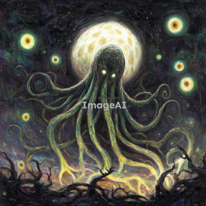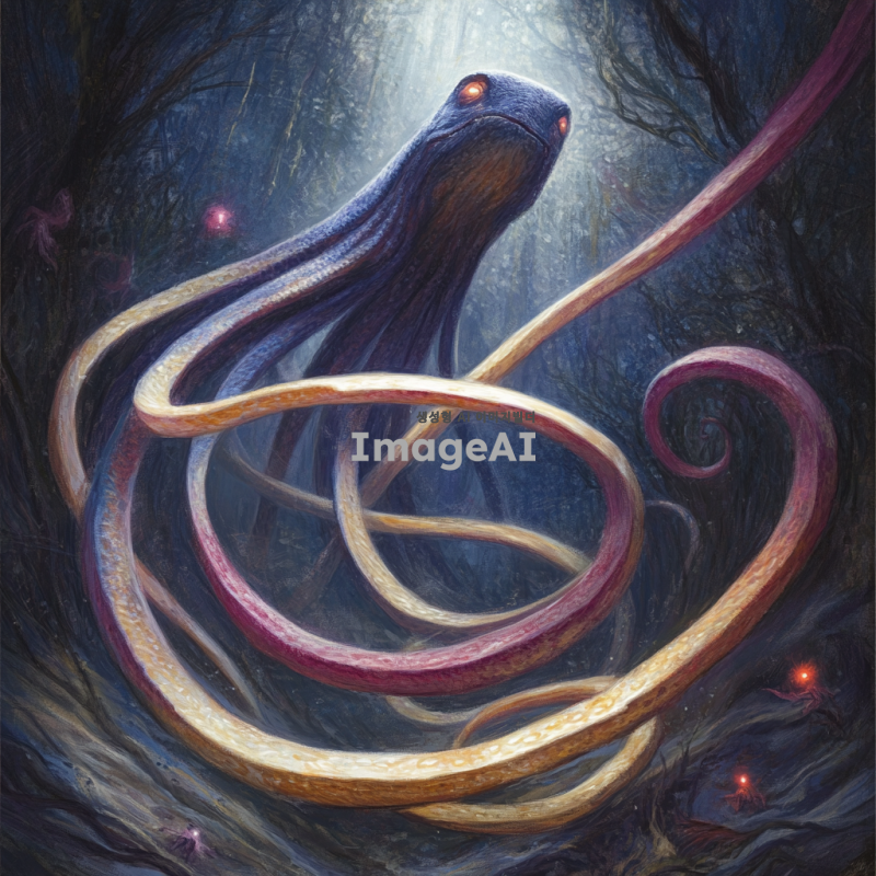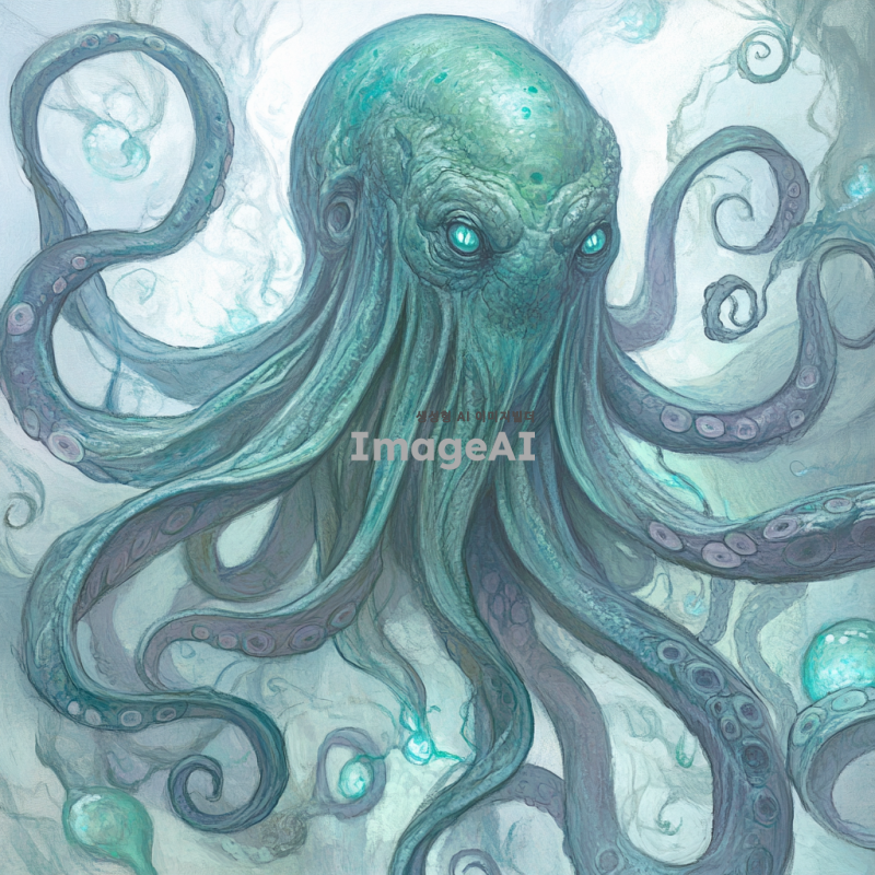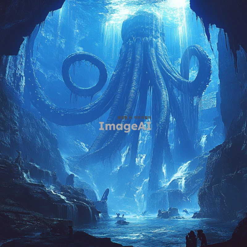 심해 속에서 웅장하게 펼쳐진 크라켄의 모습, 어두운 바다의 깊은 곳에서 거대한 촉수가 모습을 드러내며 주변을 휘감고 있는 장면, 긴장감 넘치는 분위기와 공포감을 자아내는 심해 생물들이 함께 있는 모습, 물속에서 빛나는 신비로운 생명체들이 크라켄의 위엄을 더욱 부각시키는 신비로운 색감과 조명.