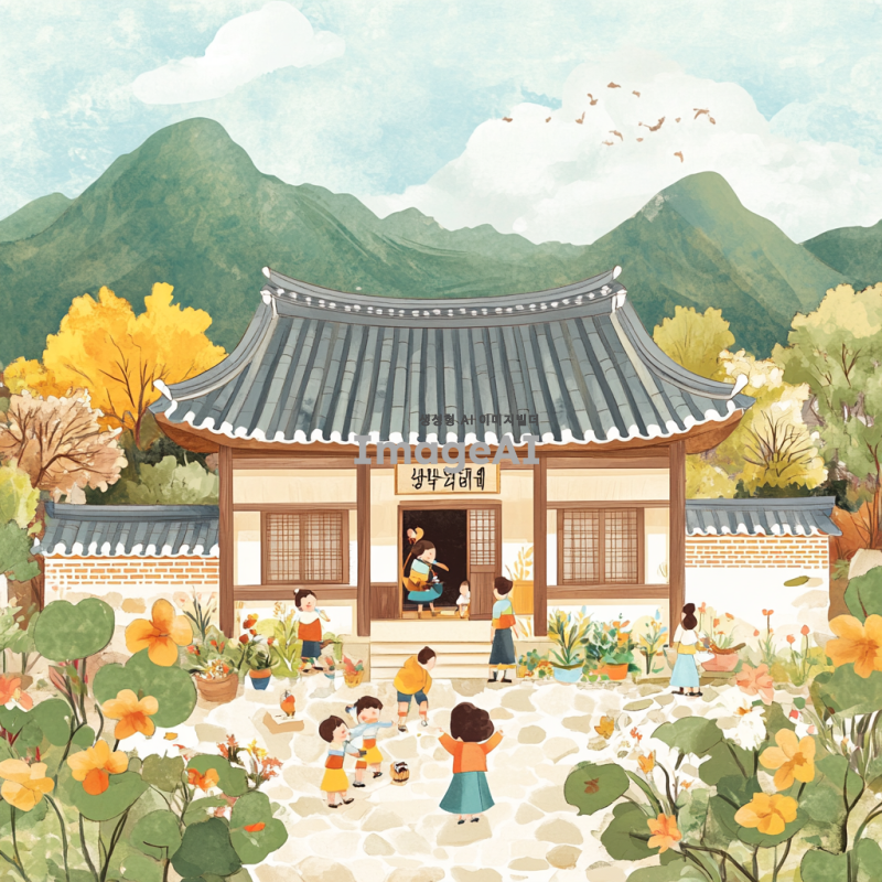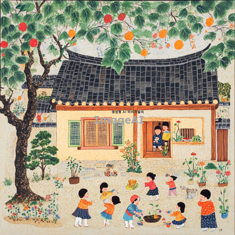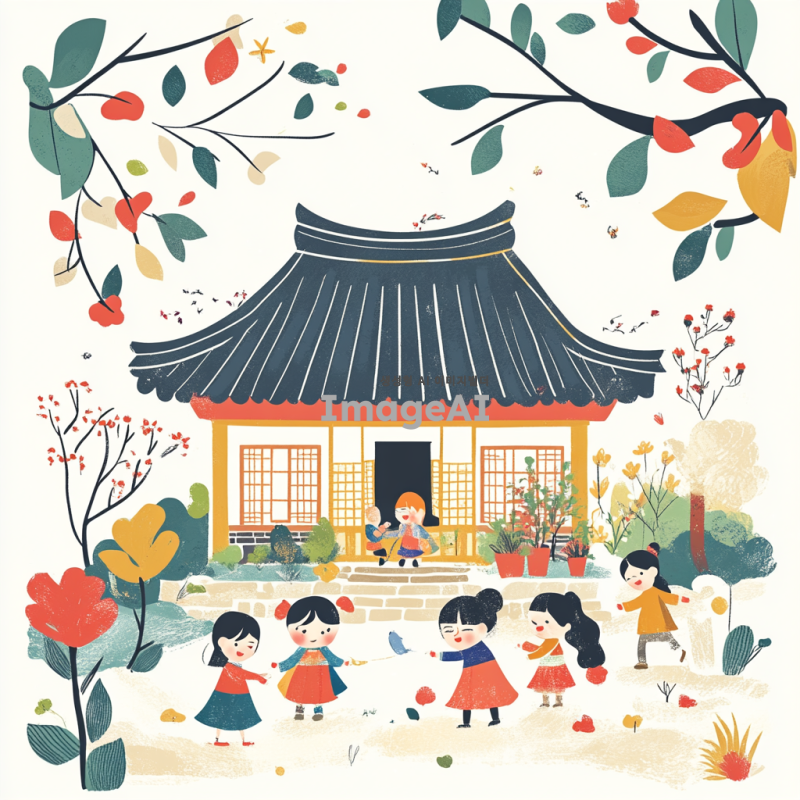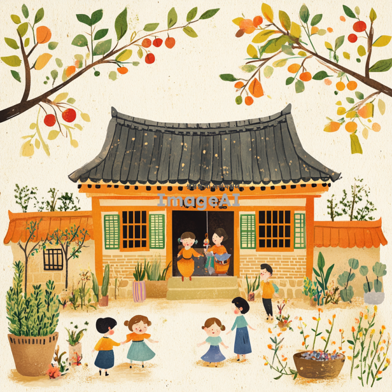 어린이가 그린 듯한 스타일의 한국 전통 주택, 일러스트로 표현된 사람과 식물, 밝고 생동감 넘치는 색상으로 아이들이 뛰어놀고 있는 모습과 함께, 따뜻하고 행복한 분위기를 연출.
