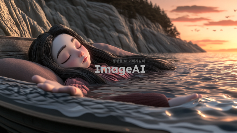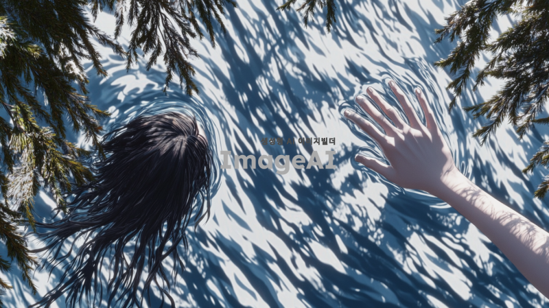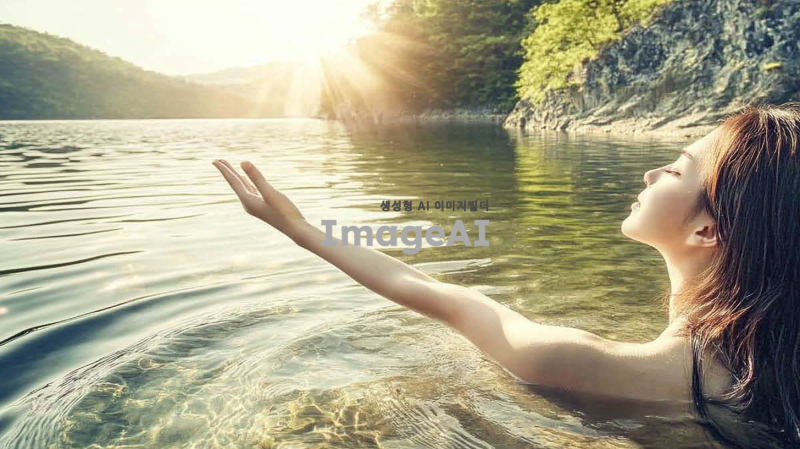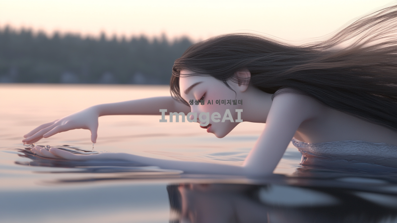 한 손을 뻗어 물의 표면을 만지는 한국인 캐릭터, 손가락 주위로 퍼지는 물결이 생동감 있게 표현된 장면, 캐릭터는 긴 머리를 가지고 있으며, 물의 반사와 빛이 어우러진 환상적인 분위기, 배경은 자연의 아름다움이 가득한 호숫가, 따뜻한 햇살이 비추는 순간.