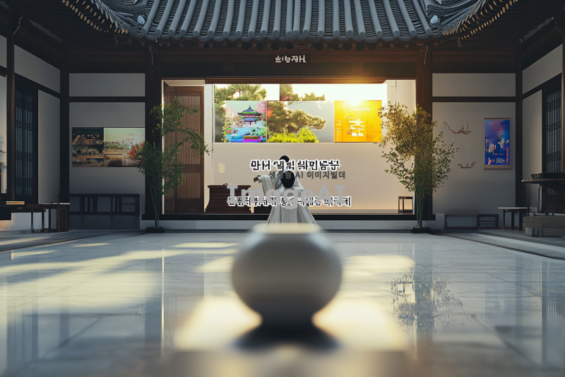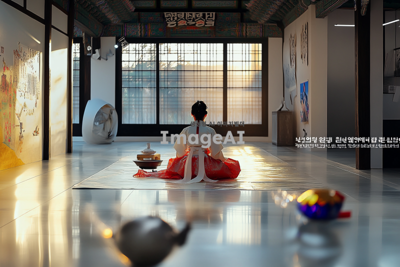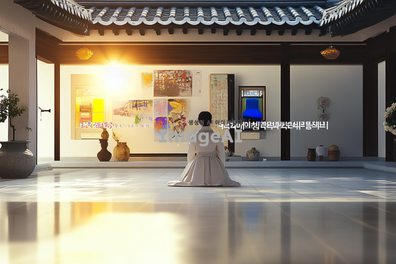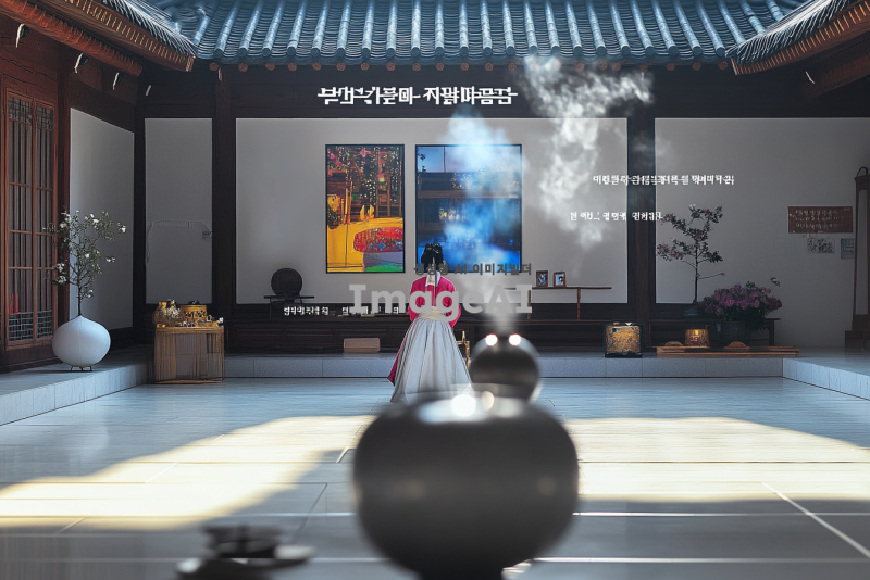 한국의 전통 문화를 주제로 한 전시를 위해, 아름다운 한옥 배경에 전통 의상을 입은 한국인이 차례를 준비하고 있는 모습. 주변에는 전통 소품들이 놓여 있고, 따뜻한 햇살이 비추는 분위기. 고요하고 평화로운 느낌을 주며, 한국의 아름다움을 강조하는 장면.