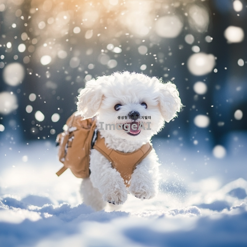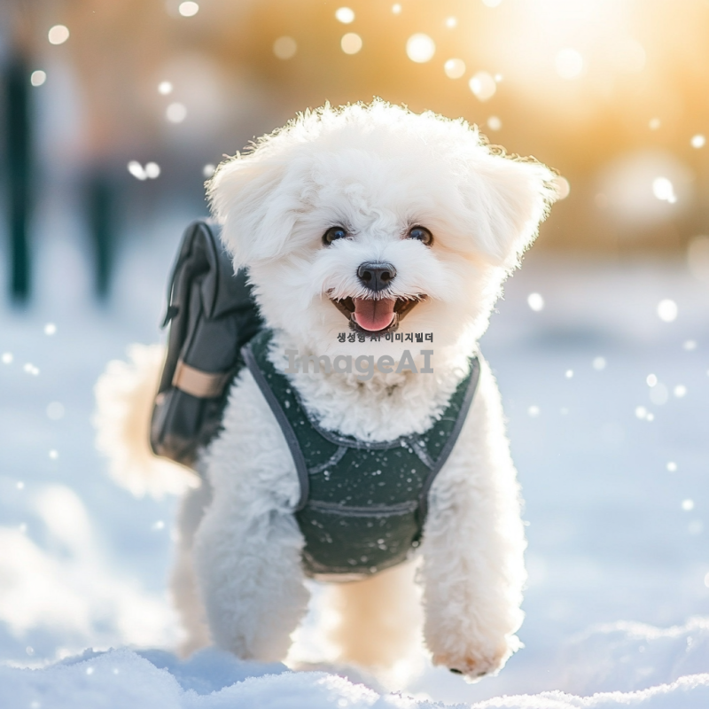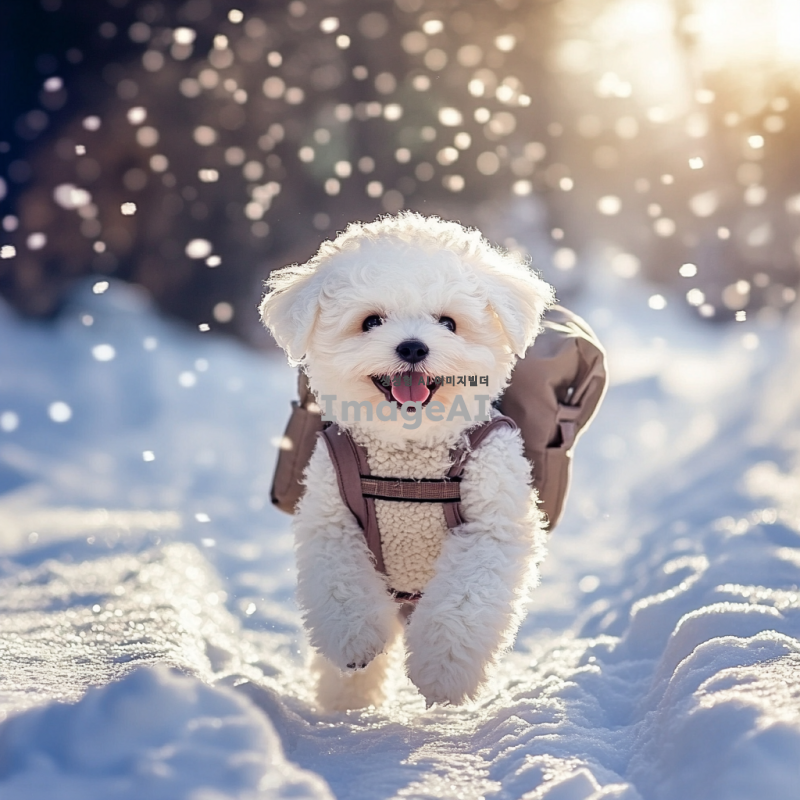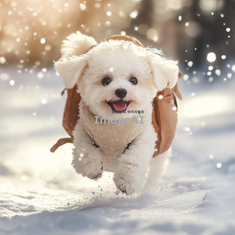 눈밭에서 행복하게 뛰어 노는 미니비숑 강아지, 산책 가방을 메고 있는 모습, 귀여운 표정과 활기찬 자세, 겨울 풍경 속에서 즐거운 분위기, 따뜻한 햇살이 비치는 장면, 주변에 하얀 눈송이가 흩날리는 모습.
