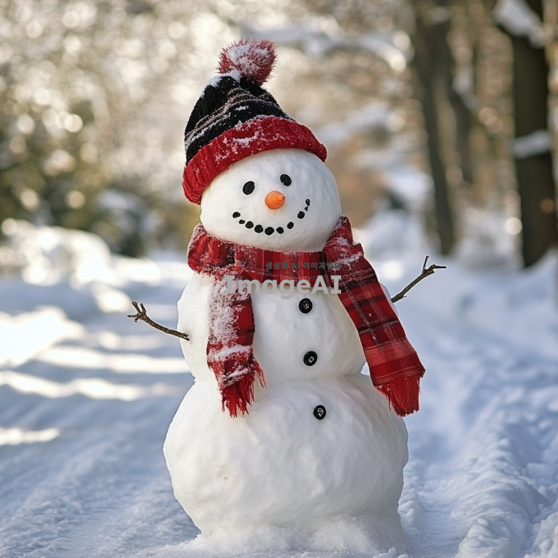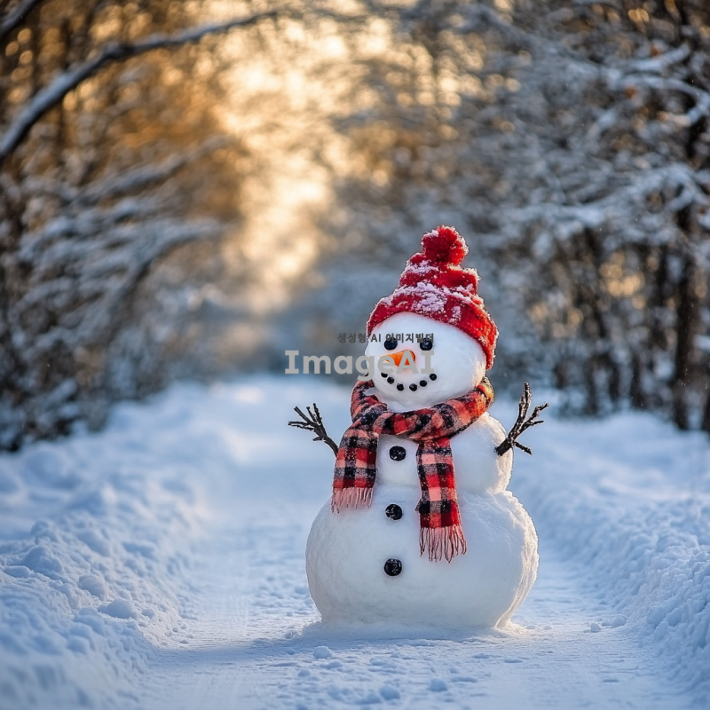 눈이 내리는 겨울 아침, 학교 가는 길에 서 있는 귀여운 눈사람. 눈사람은 크고 둥근 몸체에 모자와 스카프를 쓰고 있으며, 손에는 작은 책가방을 메고 있다. 배경에는 눈으로 덮인 나무와 학교 건물이 보이고, 주변에는 다른 아이들이 눈으로 놀고 있는 모습이 담겨 있다. 따뜻한 겨울 햇살이 비추고, 전체적으로 아기자기하고 따뜻한 분위기를 연출한다.