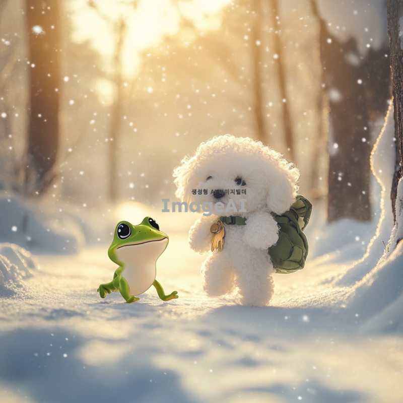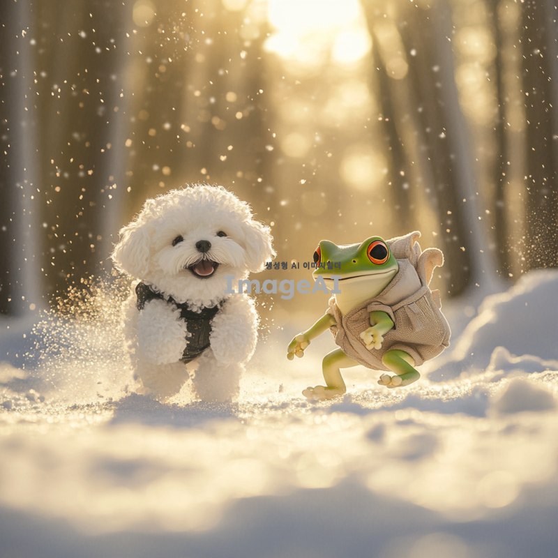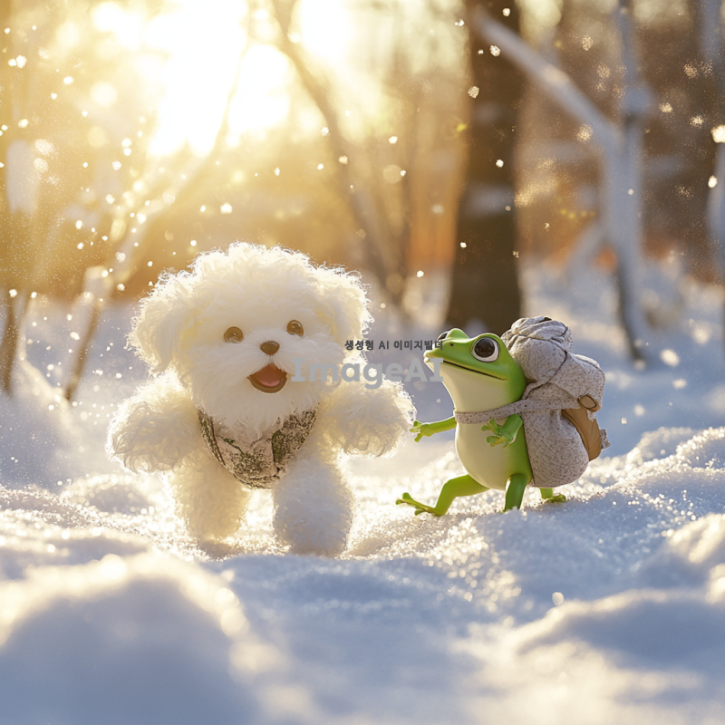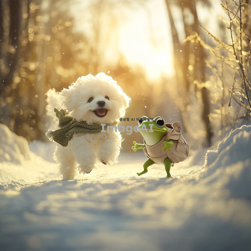 눈밭에서 행복하게 뛰어노는 개구리와 산책 가방을 맨 미니 비숑 강아지가 함께 있는 장면. 강아지는 흰 털로 덮여 있으며, 눈이 내리는 겨울 풍경 속에서 즐겁게 뛰어다니고 있다. 개구리는 초록색으로, 귀여운 표정을 지으며 강아지 옆에서 놀고 있다. 주변에는 하얀 눈과 함께 나무들이 보이고, 따스한 햇살이 비추는 모습.