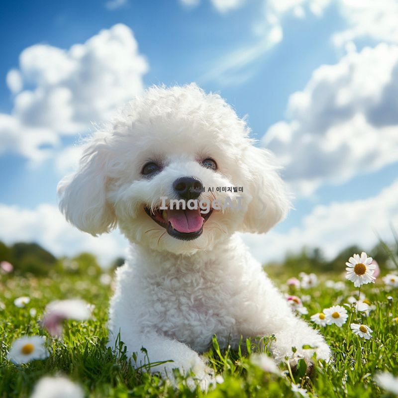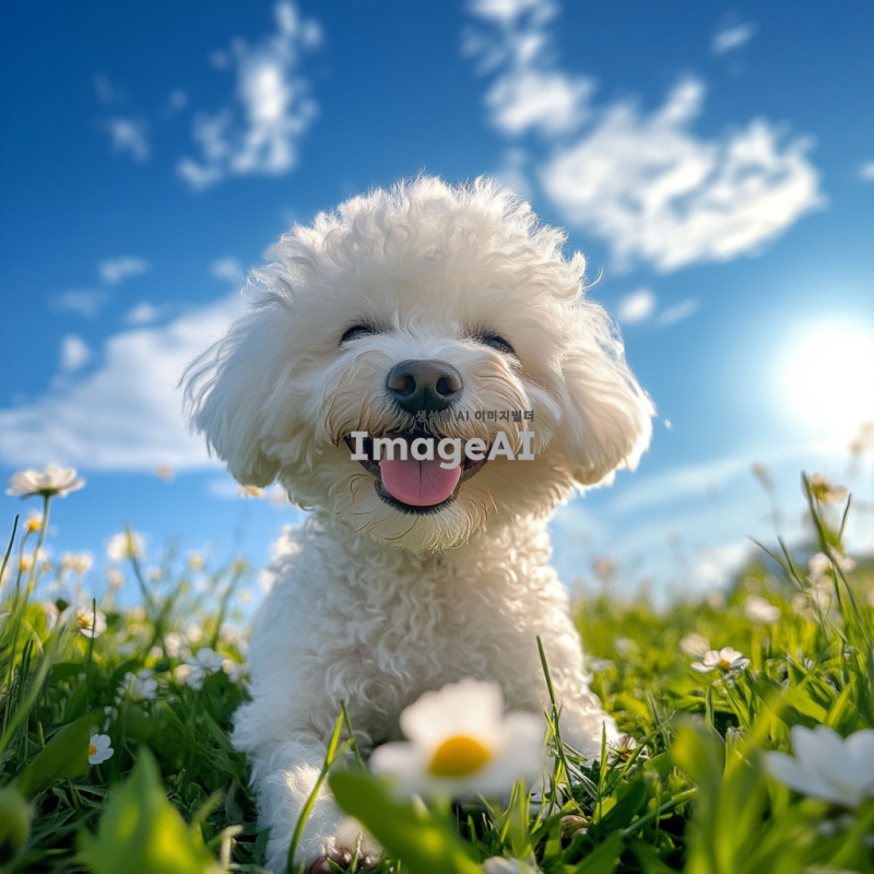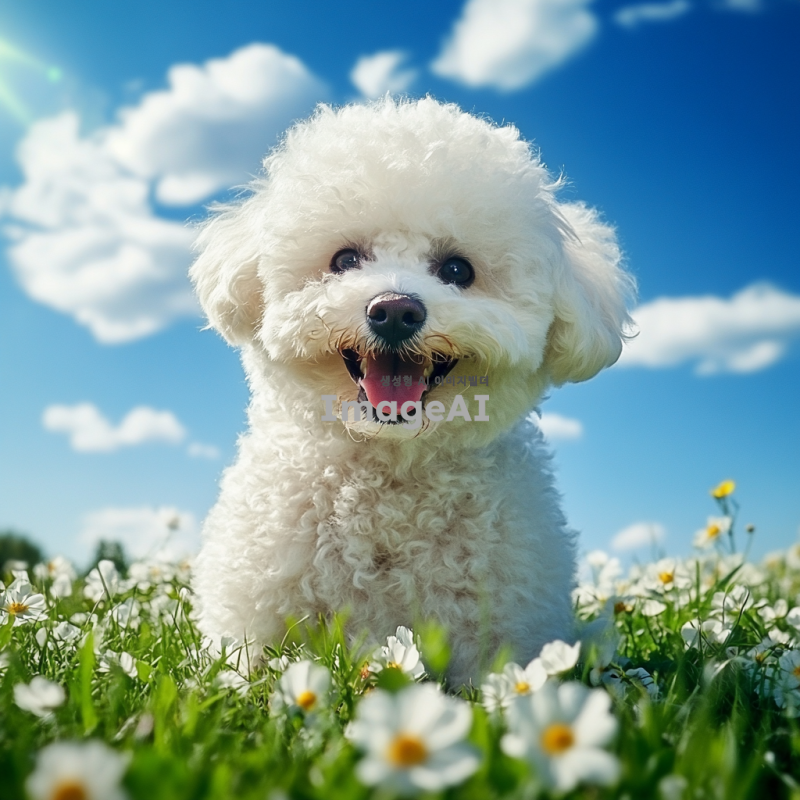 행복하게 놀고 있는 비숑 프리제, 푸른 잔디밭 위에서 해맑게 웃고 있는 모습, 햇살이 비치는 따뜻한 날씨, 주변에는 꽃들이 만발해 있고, 배경에는 푸른 하늘과 흰 구름이 떠 있는 풍경, 귀여운 표정과 털이 풍성한 모습, 사랑스러운 분위기.