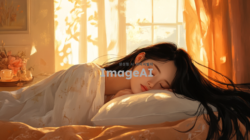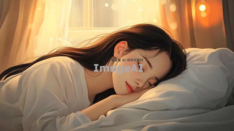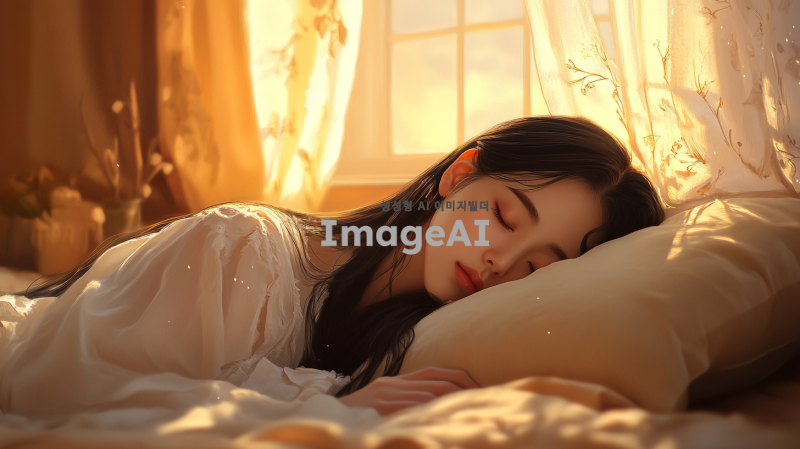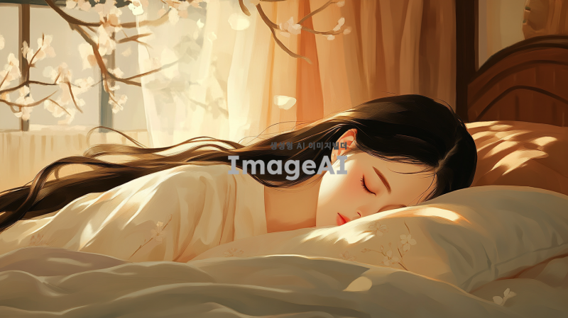 부드러운 조명의 방 안에서 편안하게 잠든 한국 여성, 그녀의 얼굴은 평화롭고 고요하며, 긴 검은 머리가 베개 위에 펼쳐져 있다. 방의 배경은 아늑한 분위기로 꾸며져 있으며, 창가에는 부드러운 커튼이 바람에 살랑거린다. 따뜻한 색조의 침대와 아기자기한 소품들이 조화를 이루고 있다.