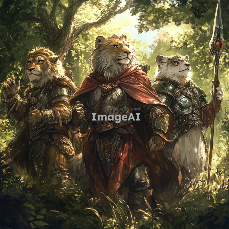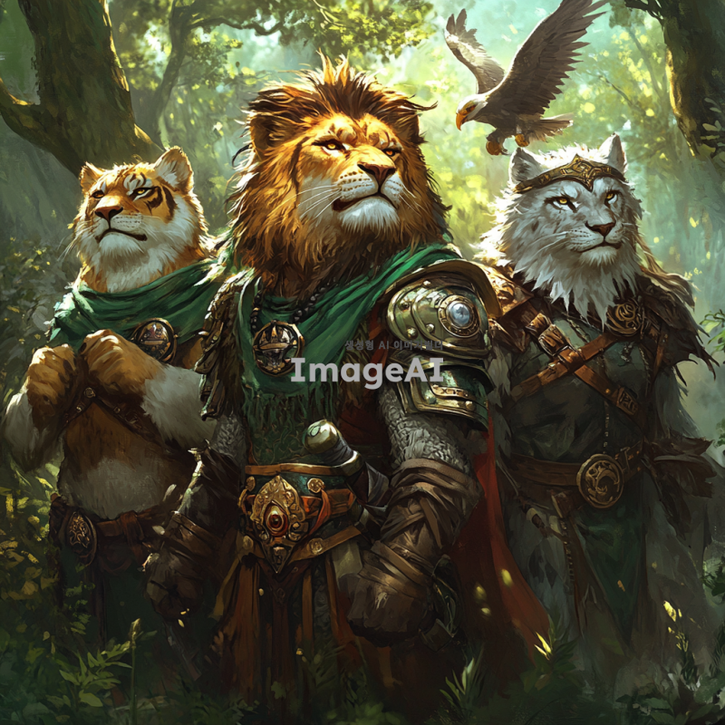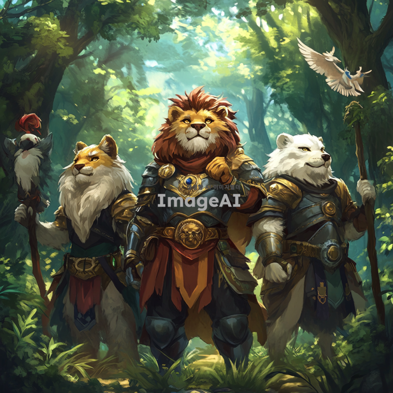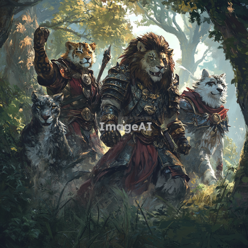 용감한 네 마리의 동물 용사들이 숲 속으로 모험을 떠나는 모습, 각기 다른 특징을 가진 동물들: 사자, 호랑이, 늑대, 그리고 독수리, 화려한 갑옷을 입고, 서로를 응원하며 숲의 다양한 나무와 풀, 신비로운 빛이 비치는 배경, 모험의 시작을 알리는 긴장감 넘치는 분위기.
