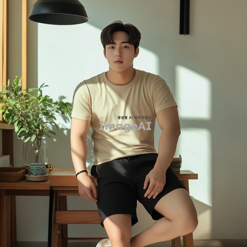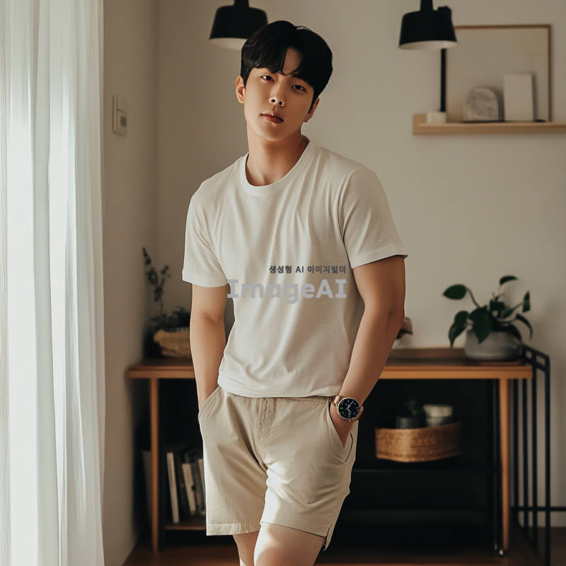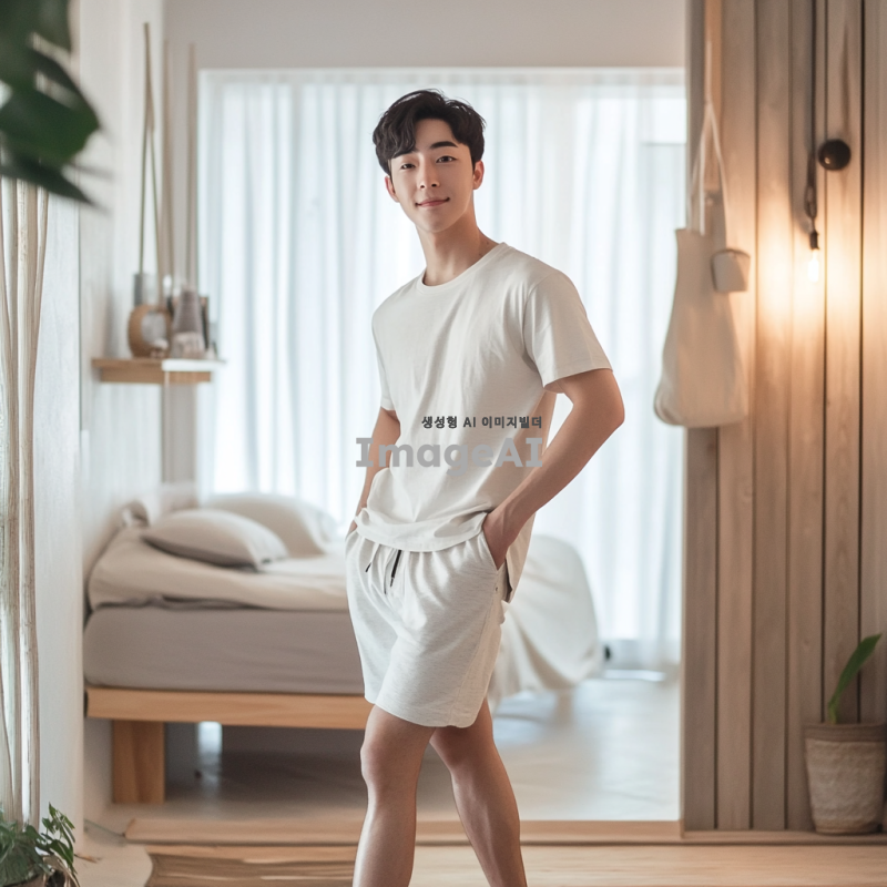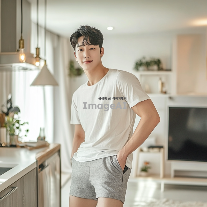 잘생긴 한국 남성이 세련된 디자인의 짧은 바지를 입고 있는 모습, 자연스러운 포즈로 자신감 넘치는 표정, 부드러운 조명 아래에서 촬영된 이미지, 배경은 심플하고 깔끔하게 정리된 방, 세련된 인테리어가 돋보이는 공간.