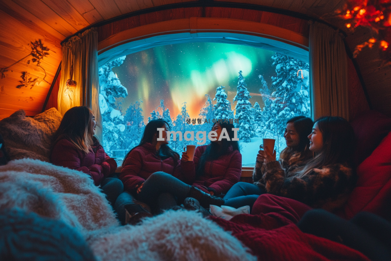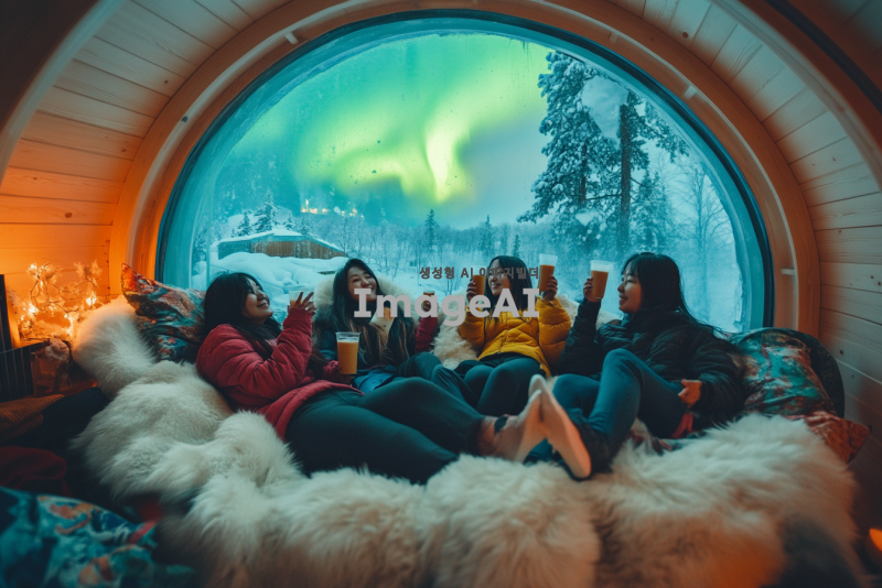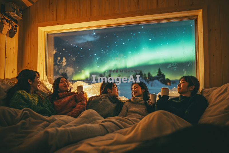 한국인 여성 5명이 핀란드 사리셀카의 이글루호텔에 누워 코코아를 마시며 창 밖의 오로라를 감상하는 모습. 따뜻한 느낌의 실내에서 아늑한 분위기를 연출하고, 오로라의 화려한 색상이 창을 통해 비치는 장면을 담아내며, 여성들은 편안한 복장으로 서로 이야기를 나누고 있는 모습.