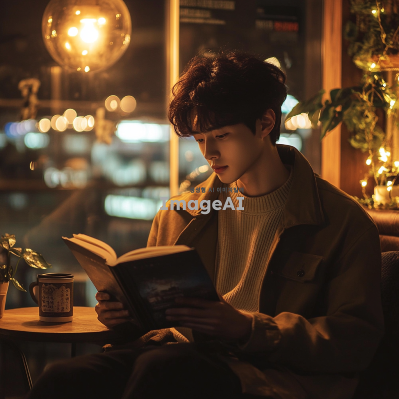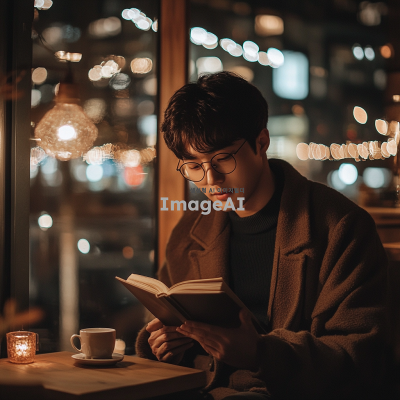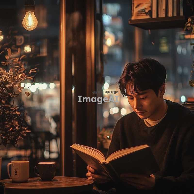 한국 남성이 도심의 카페에서 책을 읽고 있는 모습, 따뜻한 조명이 비추는 아늑한 분위기, 창밖으로 보이는 도시 풍경, 편안한 복장과 집중한 표정, 커피 잔이 옆에 놓여 있는 장면.
