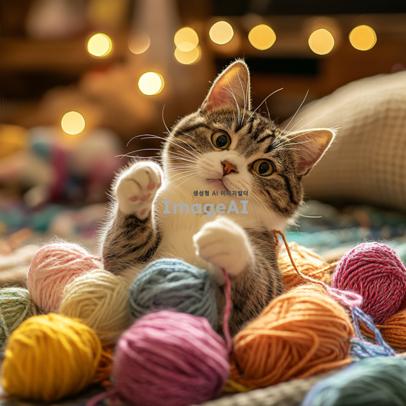고양이가 털실을 가지고서 노는 장면을 만들어 주세요.