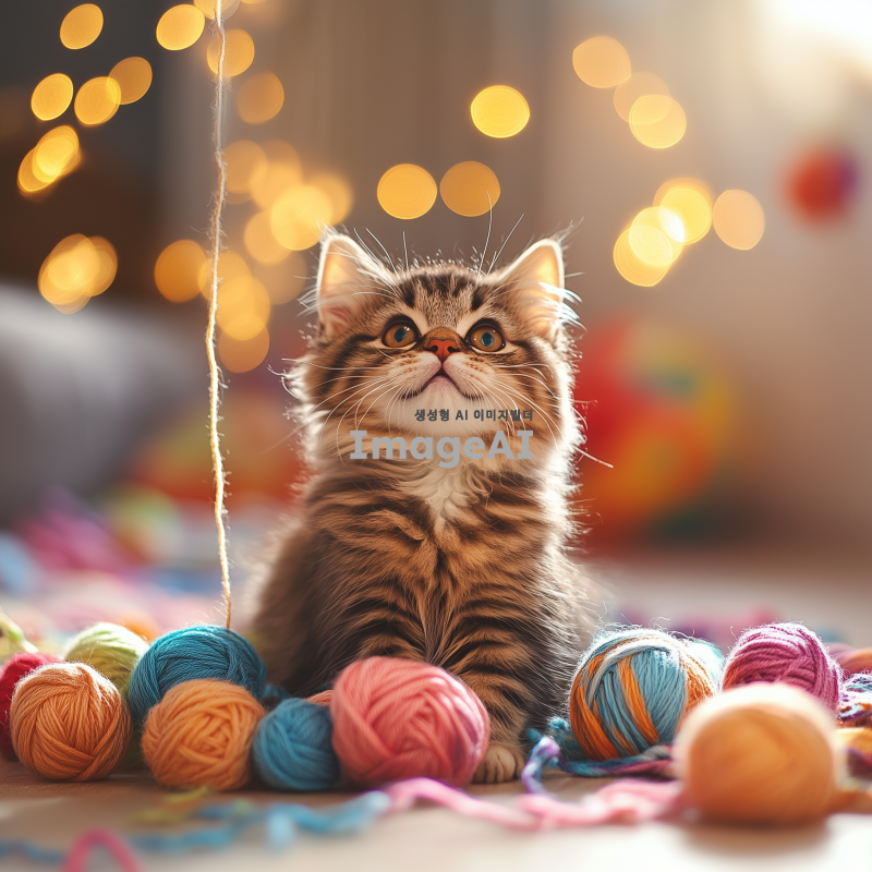 고양이가 다양한 색상의 털실을 가지고 즐겁게 노는 모습, 밝은 조명 아래에서 털실이 흩어져 있는 방 안, 고양이의 귀여운 표정과 장난스러운 자세, 주변에 놓인 장난감과 따뜻한 분위기.