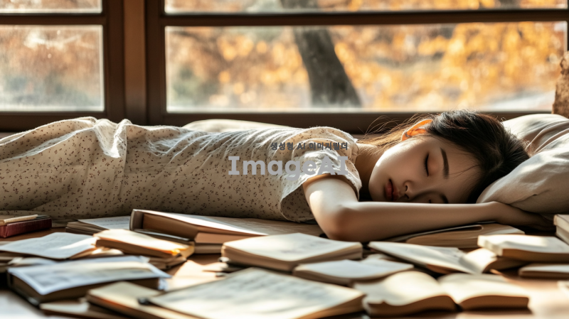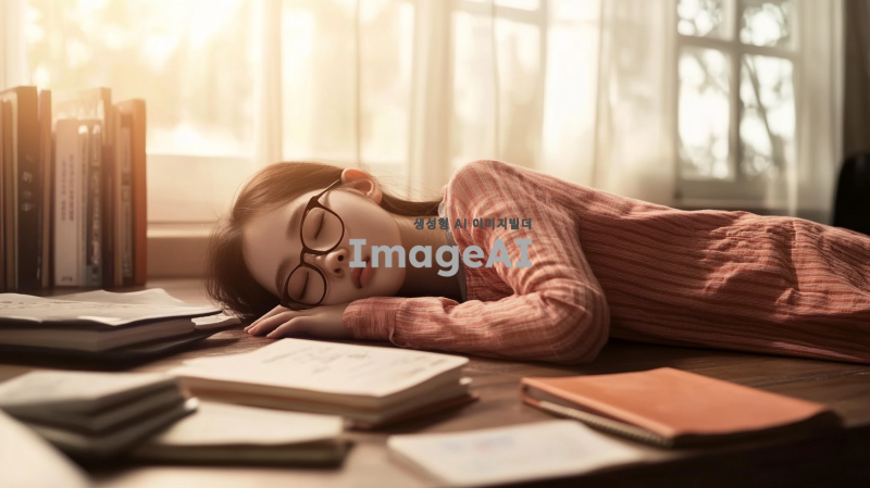 책상에 엎드려 잠자고 있는 한국인 학생, 교실의 배경, 책과 노트가 흩어져 있는 모습, 피곤한 표정, 따뜻한 햇빛이 비치는 창가, 편안한 분위기, 자연스러운 자세, 집중을 잃은 순간.