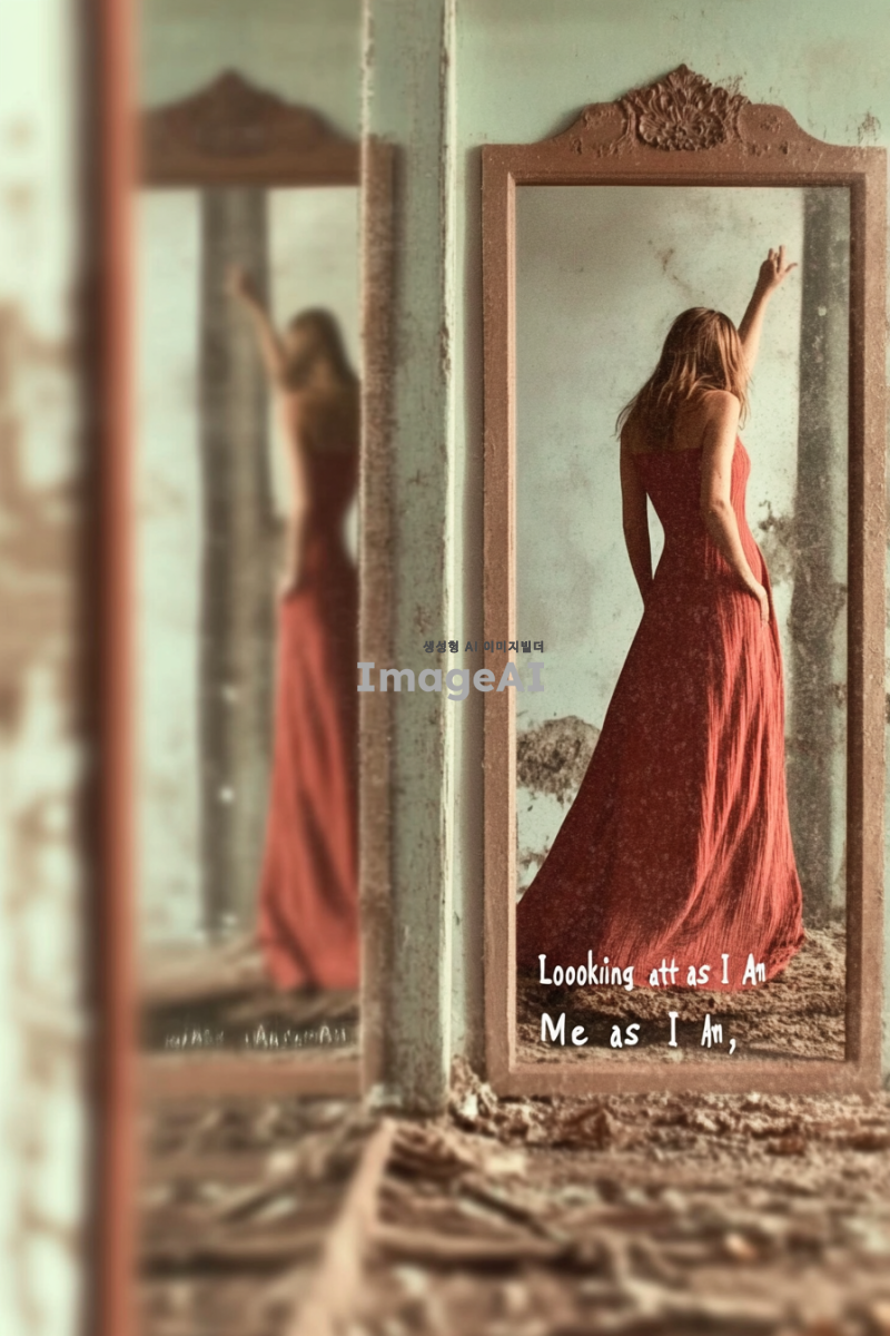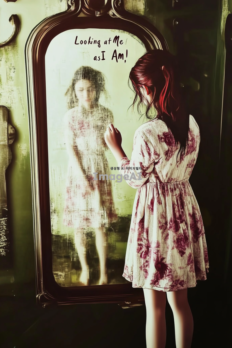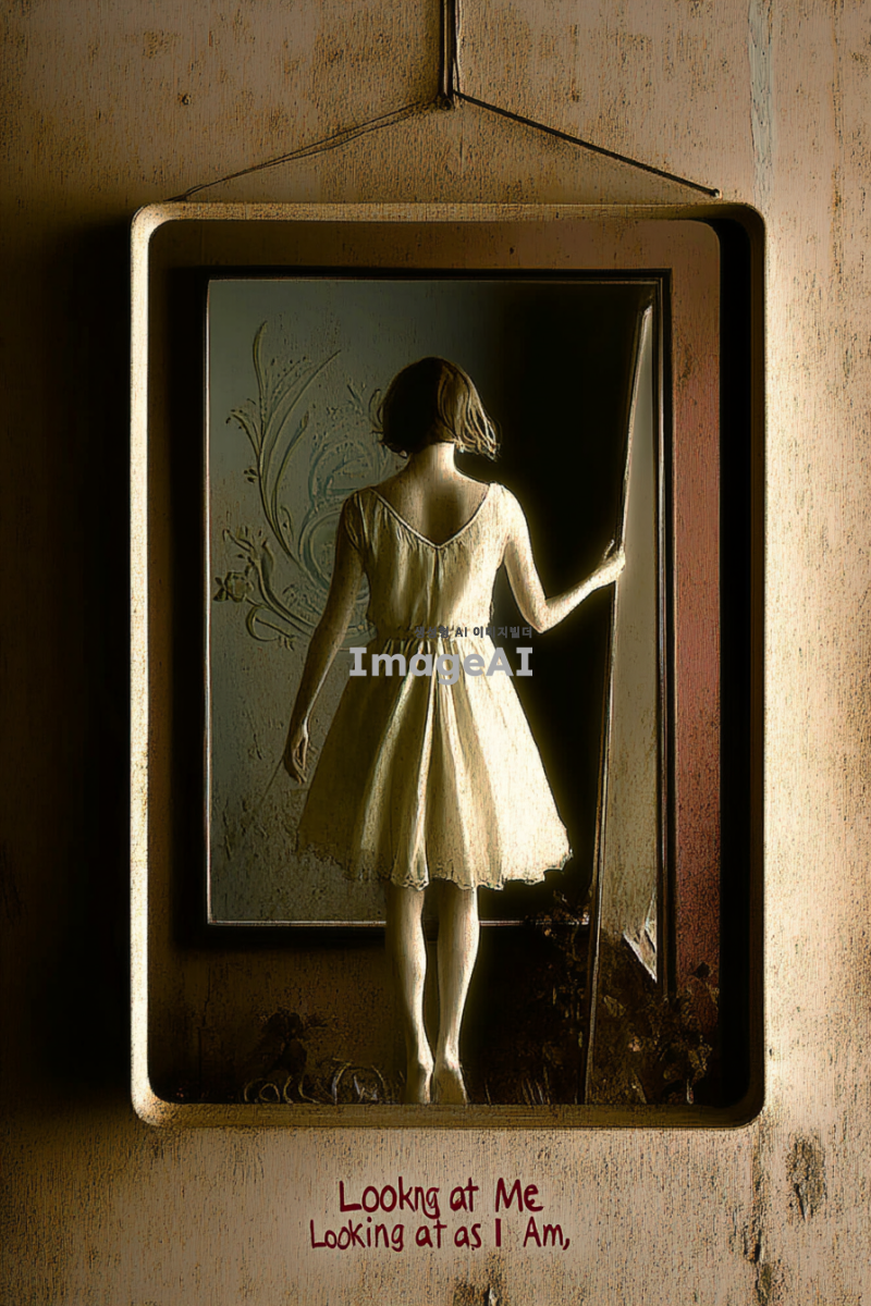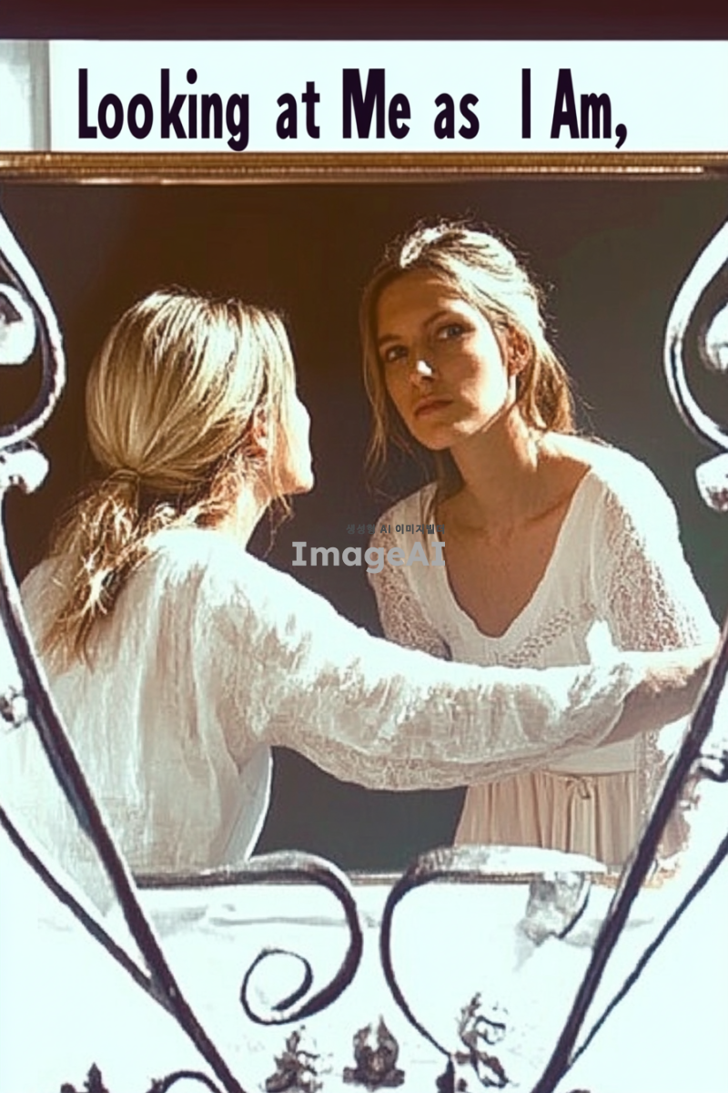 책 표지에 들어갈 그림, 책 제목은 있는 그대로 나를 바라보기, 분야는 에세이, 사색하는 여성의 모습, 거울을 보는 여성의 모습