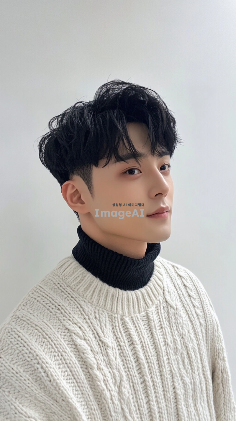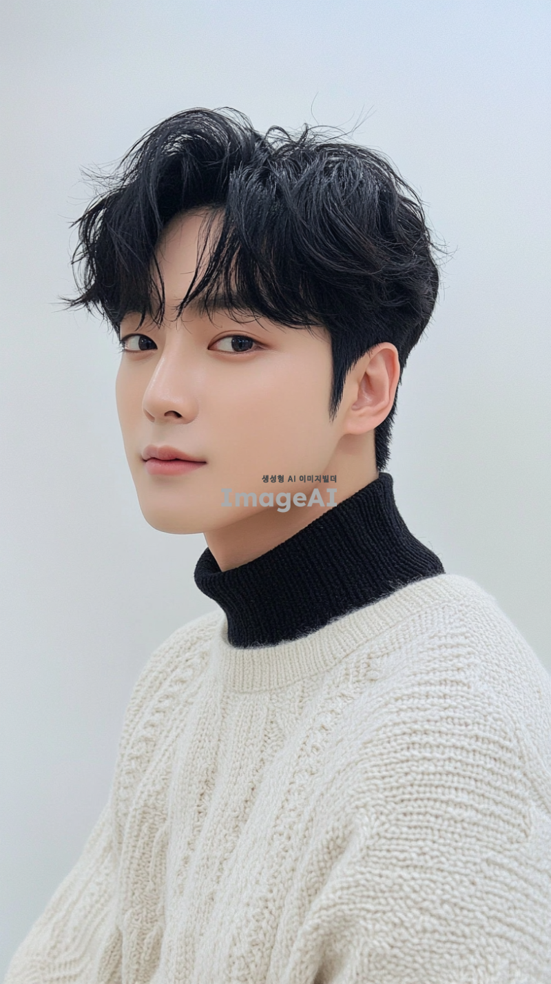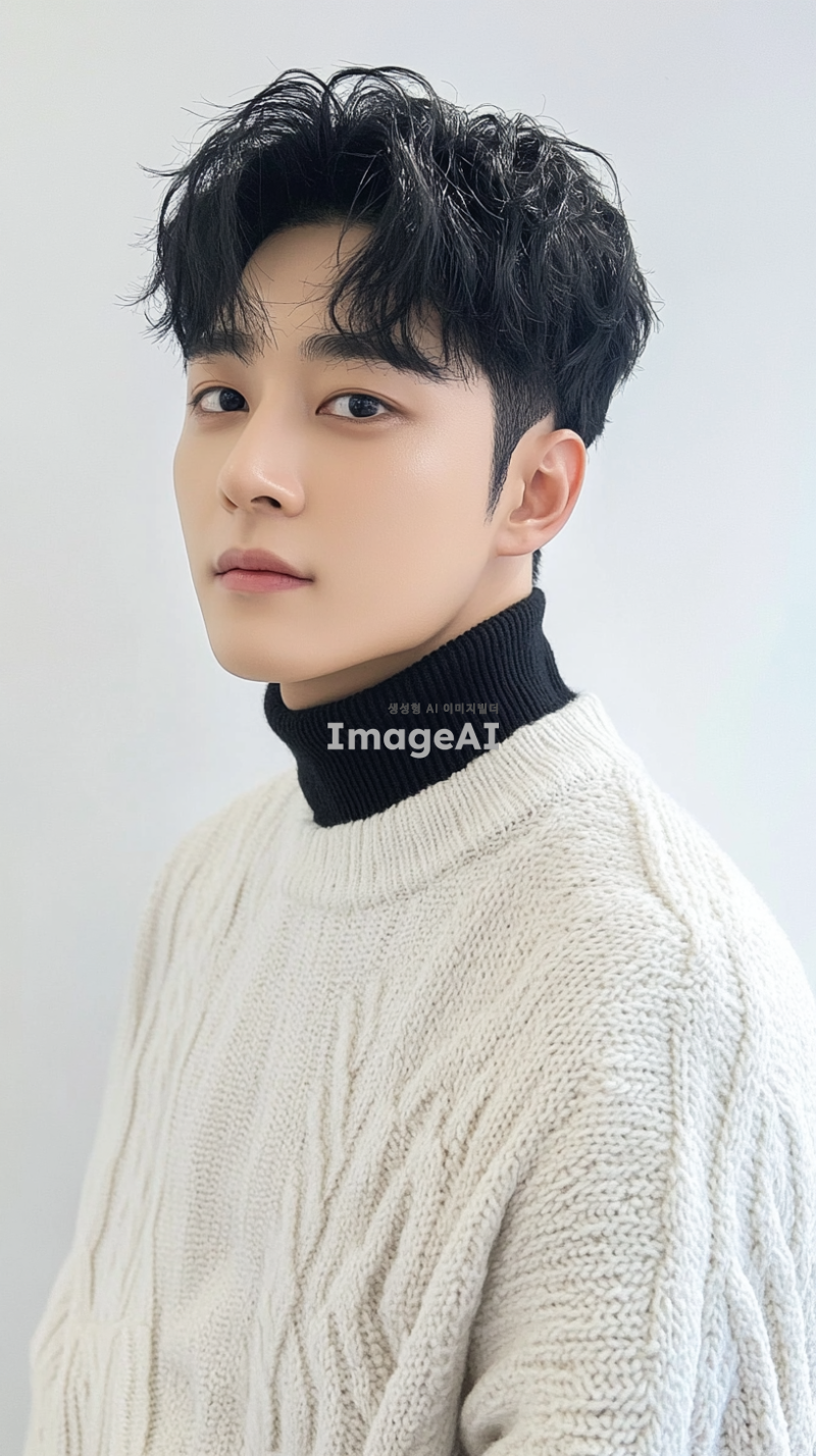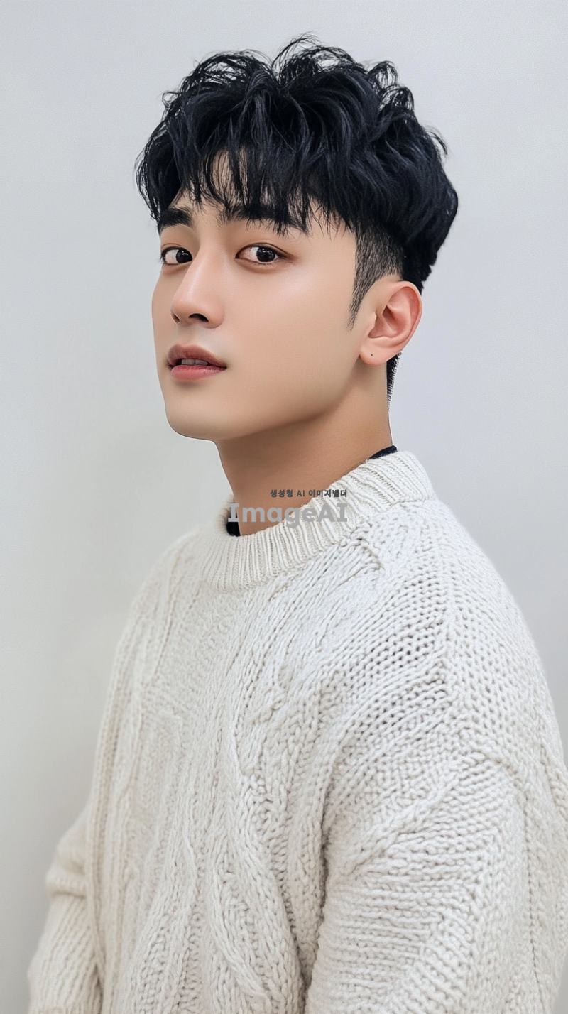 검은 머리를 가진 남자가 하얀 오버사이즈 스웨터를 입고 전신 사진을 위해 포즈를 취하고 있으며, 짧은 머리 스타일의 한국 패션을 연출하고 있다. 배경은 흰색이며, 측면에서 찍은 사진으로 중간 길이의 머리, 부드러운 조명, 검은 색조가 특징이다. 그는 잘생긴 외모와 매력적인 미소를 지니고 있으며, 매우 젊어 보인다.