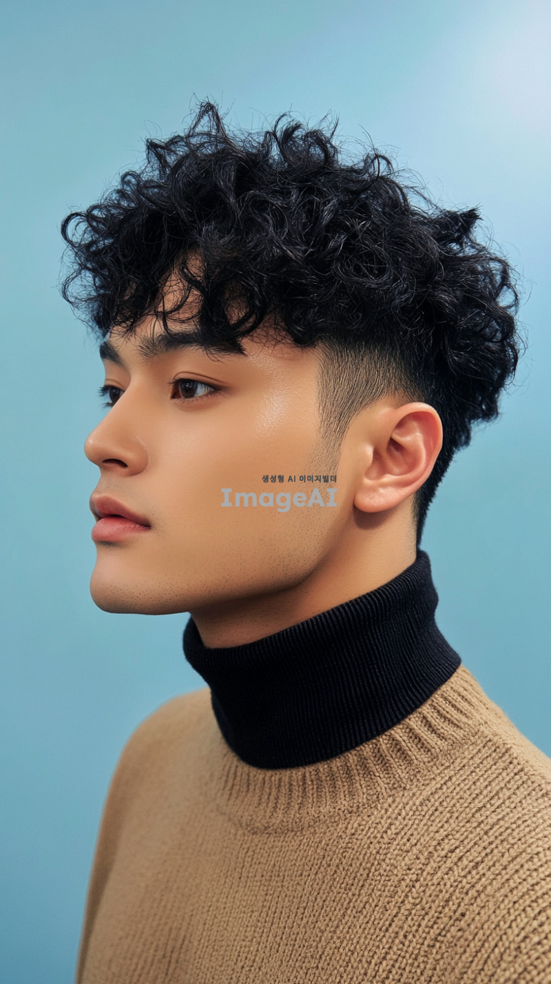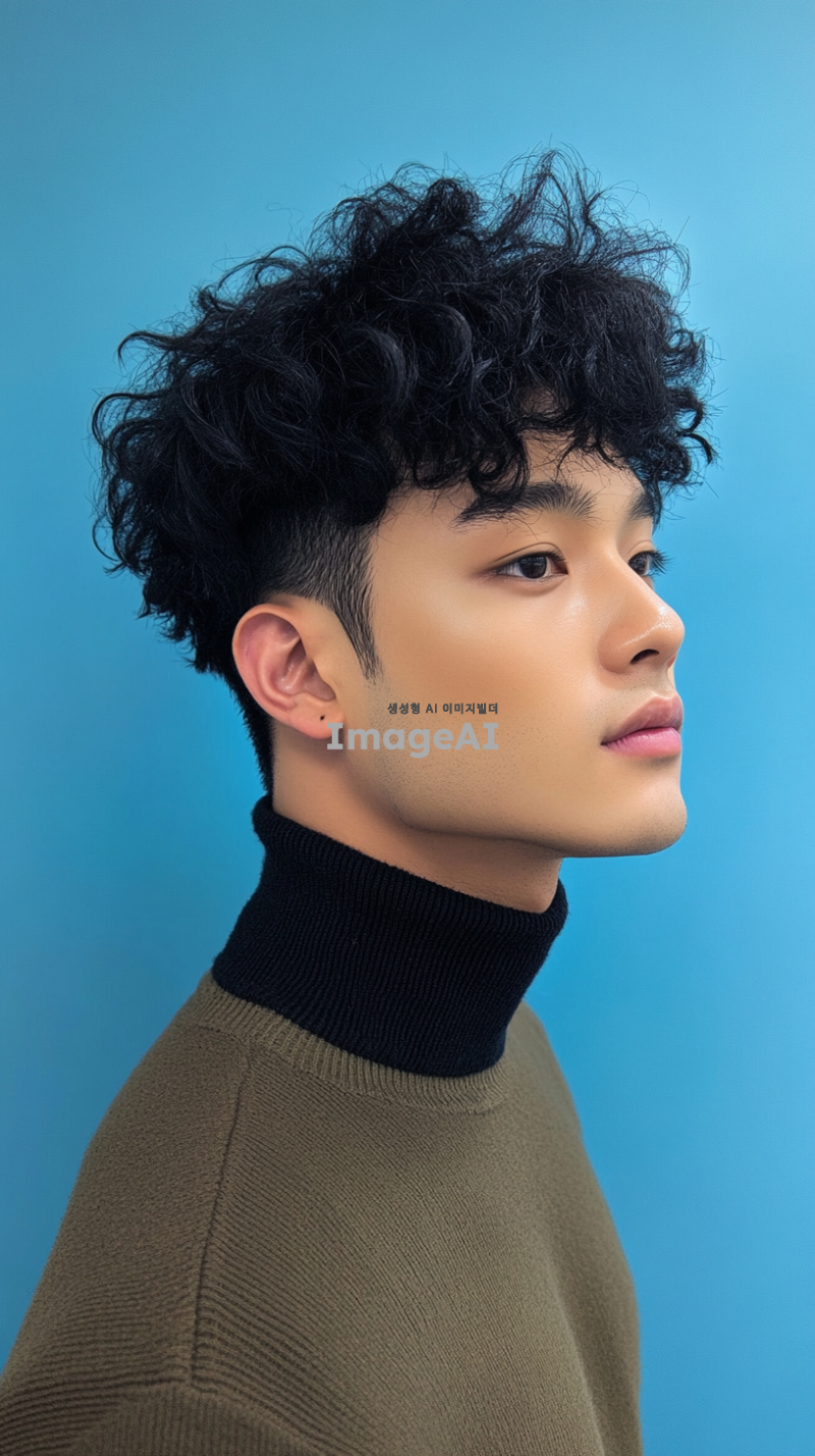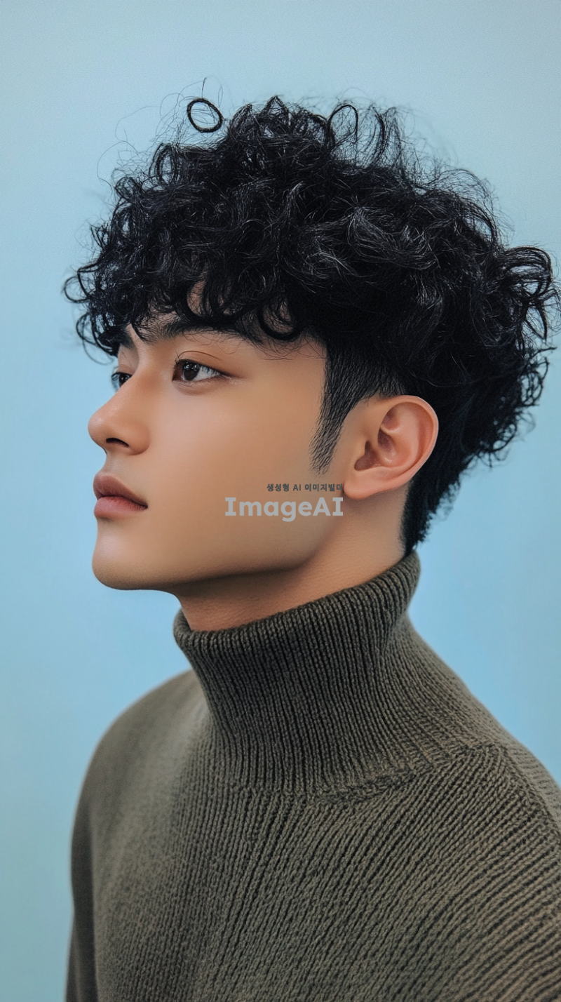 잘생긴 남자가 검은 곱슬머리를 하고 옆모습으로 촬영되었으며, 파란 배경에 카키색 하이넥 스웨터를 입고 있습니다. 그는 밝은 피부 톤과 자연스럽고 자신감 있는 표정을 가지고 있습니다. 그의 디테일은 섬세한 질감을 가지고 있으며, 색상은 신선하고 생동감 있습니다.