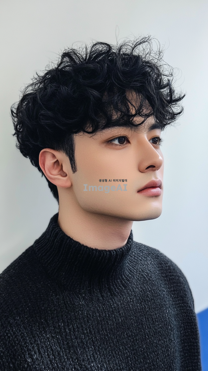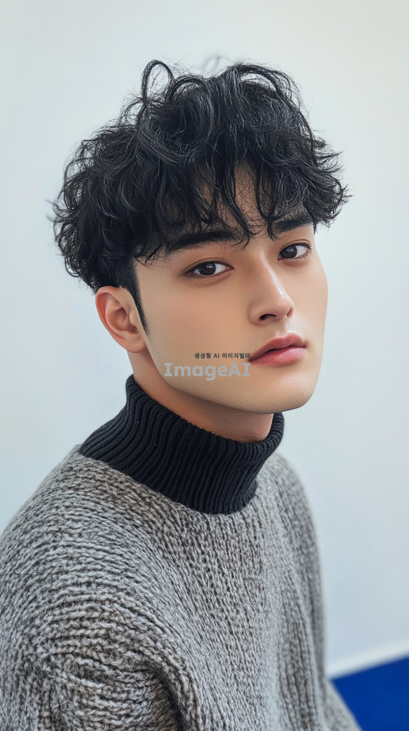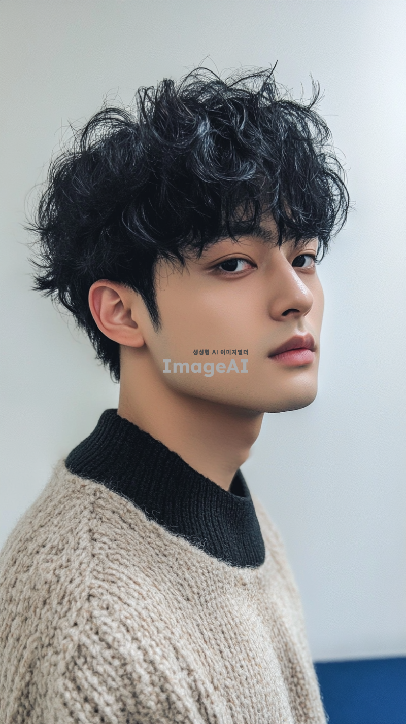 검은 머리를 가진 남자가 오버사이즈 스웨터와 짧은 소매를 입고 있습니다. 배경은 흰 벽과 파란 카펫입니다. 그는 머리에 곱슬거리는 앞머리를 가지고 있으며, 레트로 스타일의 헤어컷과 검은색 및 회색 색상 조합을 가지고 있습니다. 상반신 사진으로 부드러운 조명, 자연스러운 표정, 측면 앵글, 패셔너블한 헤어스타일, 잘생긴 얼굴을 특징으로 합니다.