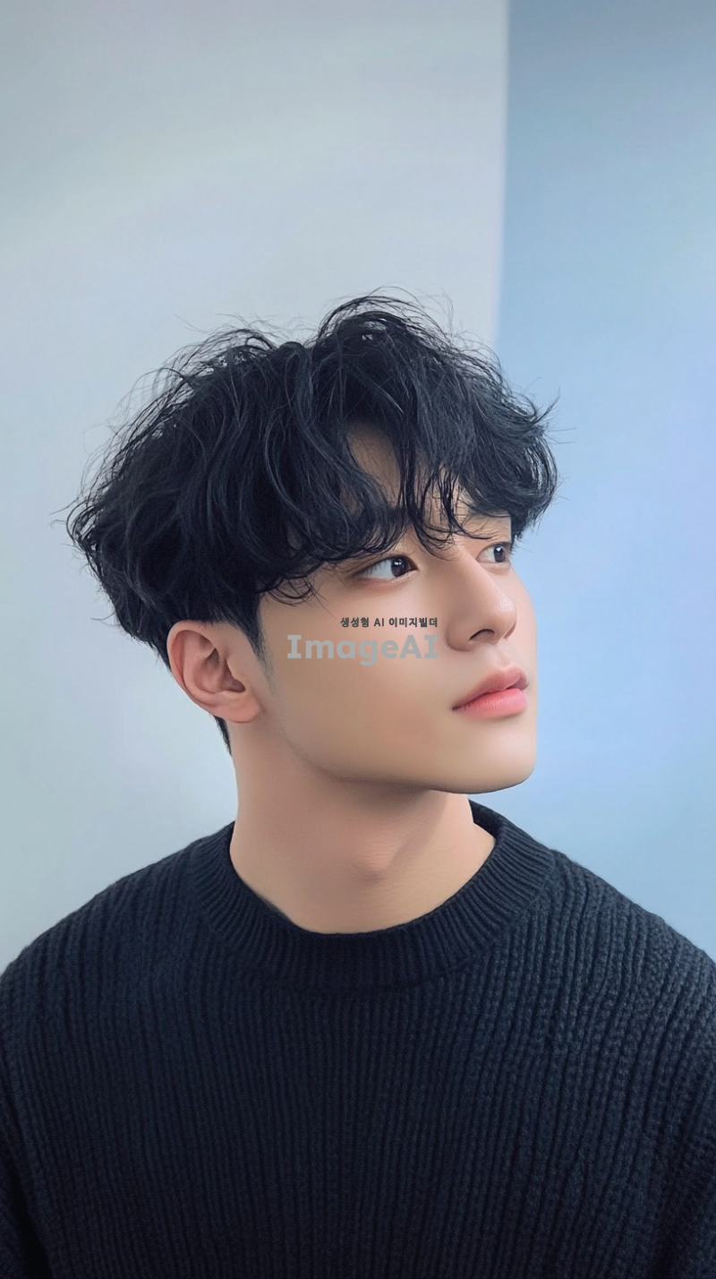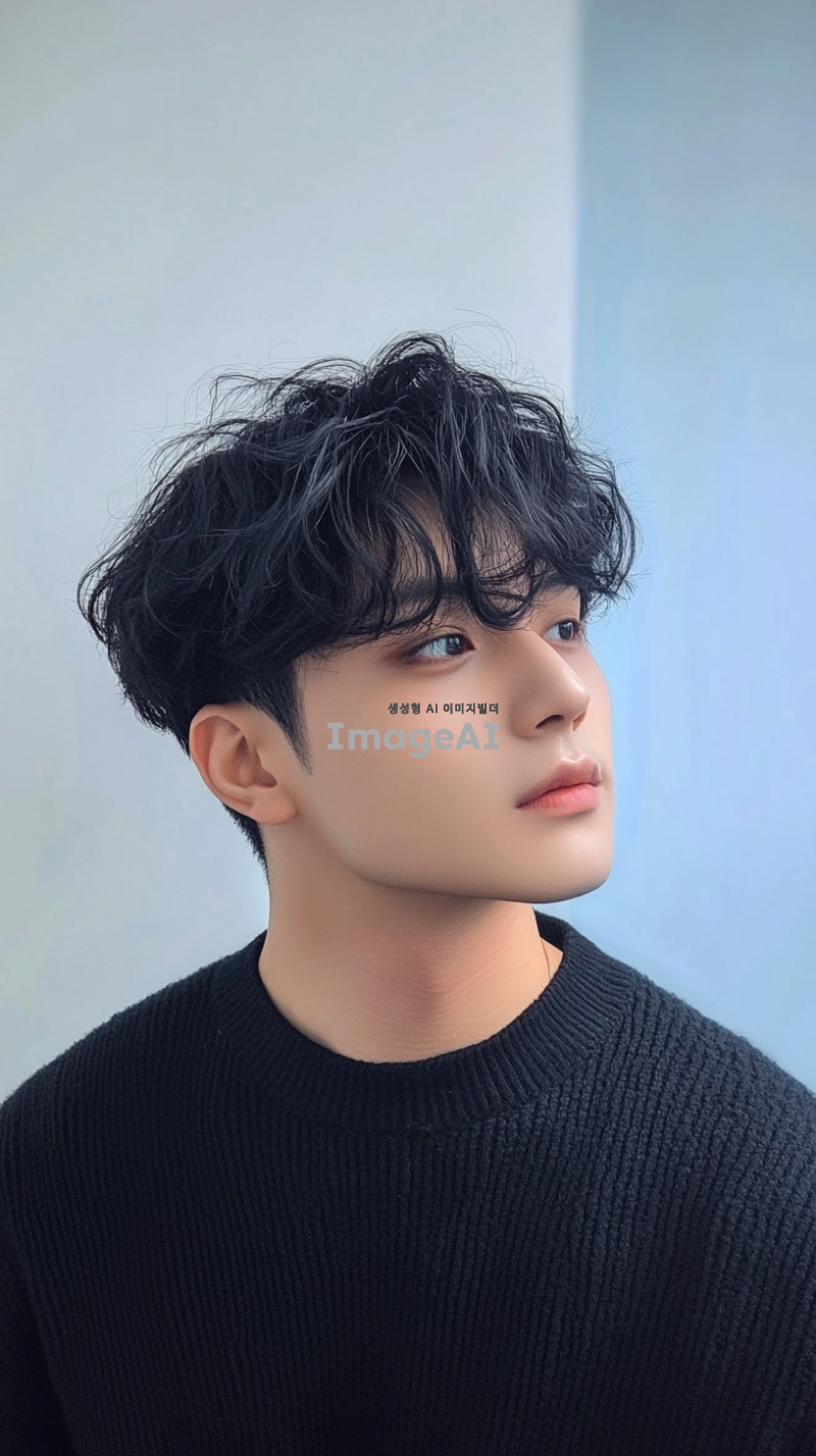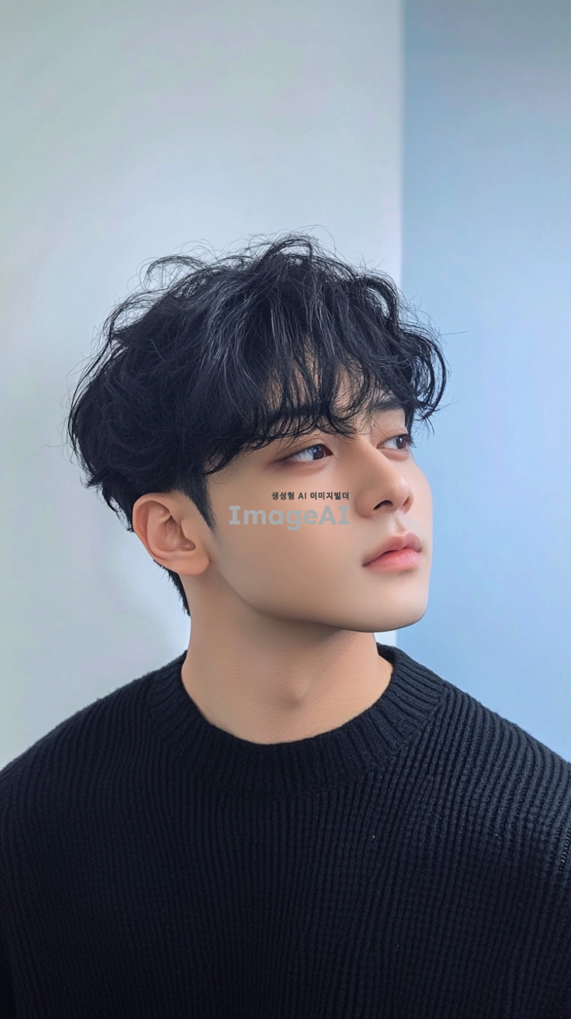 잘생긴 남자가 검은 머리를 가지고 있으며, 전체가 검은 스웨터를 입고 흰색 배경에 반신 프로필 사진을 찍었습니다. 그는 평평하고 짧은 곱슬머리 스타일에 약간 헝클어진 앞머리와 어깨 길이의 검은 머리를 가지고 있습니다. 배경은 파란 벽과 연한 회색의 단색 배경으로, 부드러운 조명과 선명한 디테일이 있는 미니멀한 구성을 만듭니다. 그의 자연스러운 피부 톤과 자신감 있는 미소가 이미지를 완성합니다.
