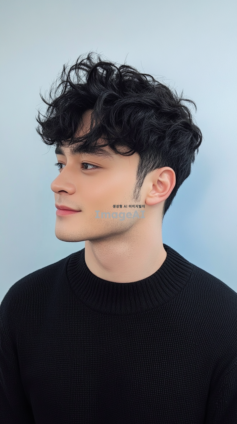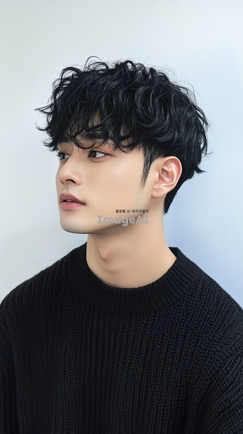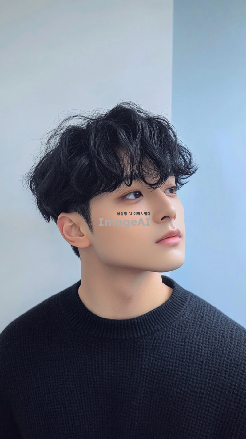 잘생긴 남자가 검은 머리를 가지고 있으며, 전체가 검은 스웨터를 입고 흰색 배경에 반신 프로필 사진을 찍었습니다. 그는 평평하고 짧은 곱슬머리 스타일에 약간 헝클어진 앞머리와 어깨 길이의 검은 머리를 가지고 있습니다. 배경은 파란 벽과 연한 회색의 단색 배경으로, 부드러운 조명과 선명한 디테일이 있는 미니멀한 구성을 만듭니다. 그의 자연스러운 피부 톤과 자신감 있는 미소가 이미지를 완성합니다.