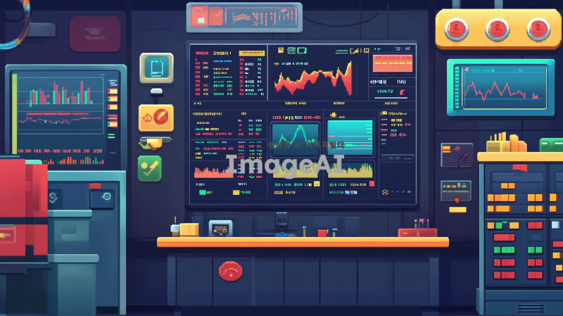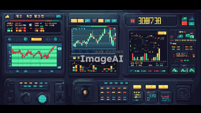 주식 게임을 위한 픽셀 아트 스타일의 사용자 인터페이스 디자인, 한국의 주식 시장을 반영한 그래픽 요소들, 다양한 주식 차트와 데이터 표시, 직관적인 버튼과 메뉴 구성, 밝고 경쾌한 색상 조합, 픽셀 아트 특유의 귀여운 캐릭터와 아이콘들, 게임의 몰입감을 높이는 배경 디자인.
